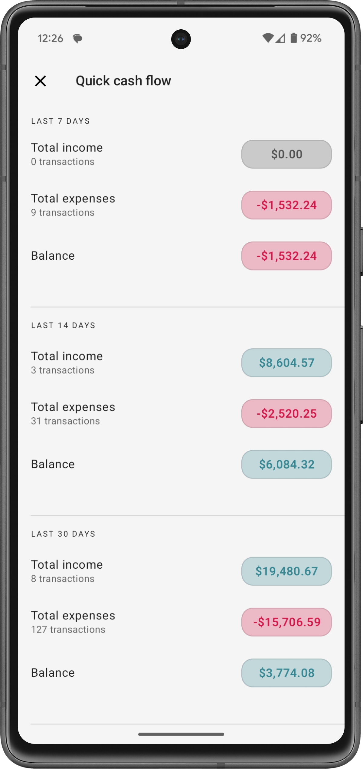 Oggi, Ultimi 7 Giorni, 14 Giorni, 30 Giorni, Questo Mese, Mese Precedente, ecc.: La vista del cash flow rapido suddivide la tua attività finanziaria in tre periodi distinti—l'ultima settimana, le ultime due settimane e l'ultimo mese. Questo ti consente di individuare facilmente tendenze o cambiamenti nelle tue spese e entrate su diverse durate temporali.