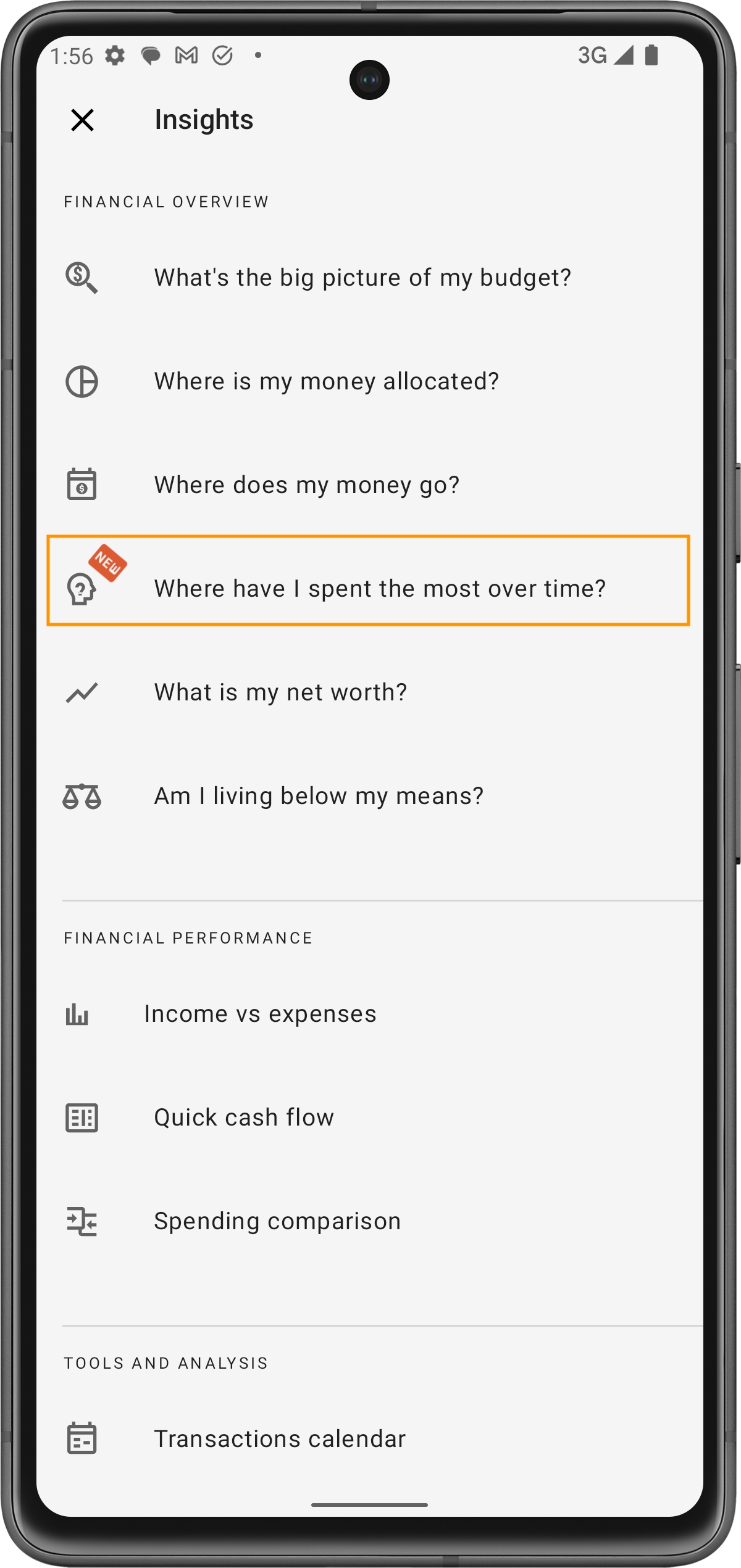 L'insight "Dove ho speso di più nel tempo?" offre una visione dettagliata dei tuoi schemi di spesa nelle diverse categorie su lunghi periodi. Questo strumento ti aiuta a capire quali aree occupano costantemente la maggior parte del tuo budget.
