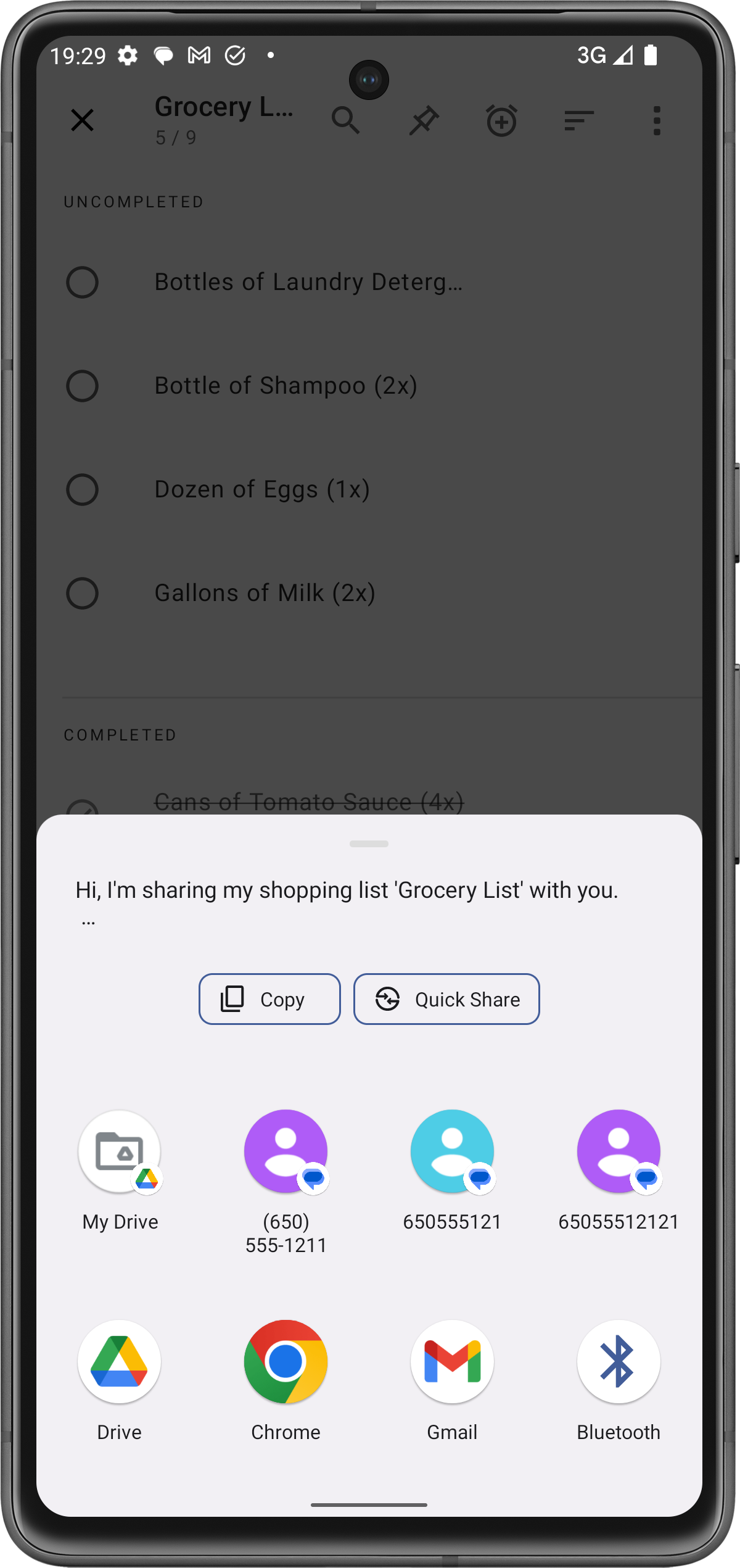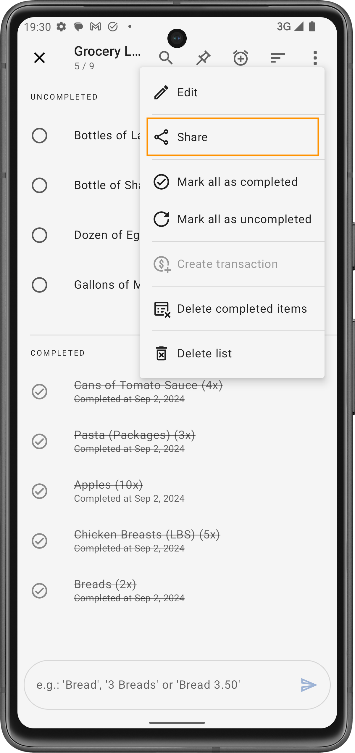 Puoi condividere la tua lista della spesa con altri toccando il menu a tre puntini nell'angolo in alto a destra e selezionando Condividi.