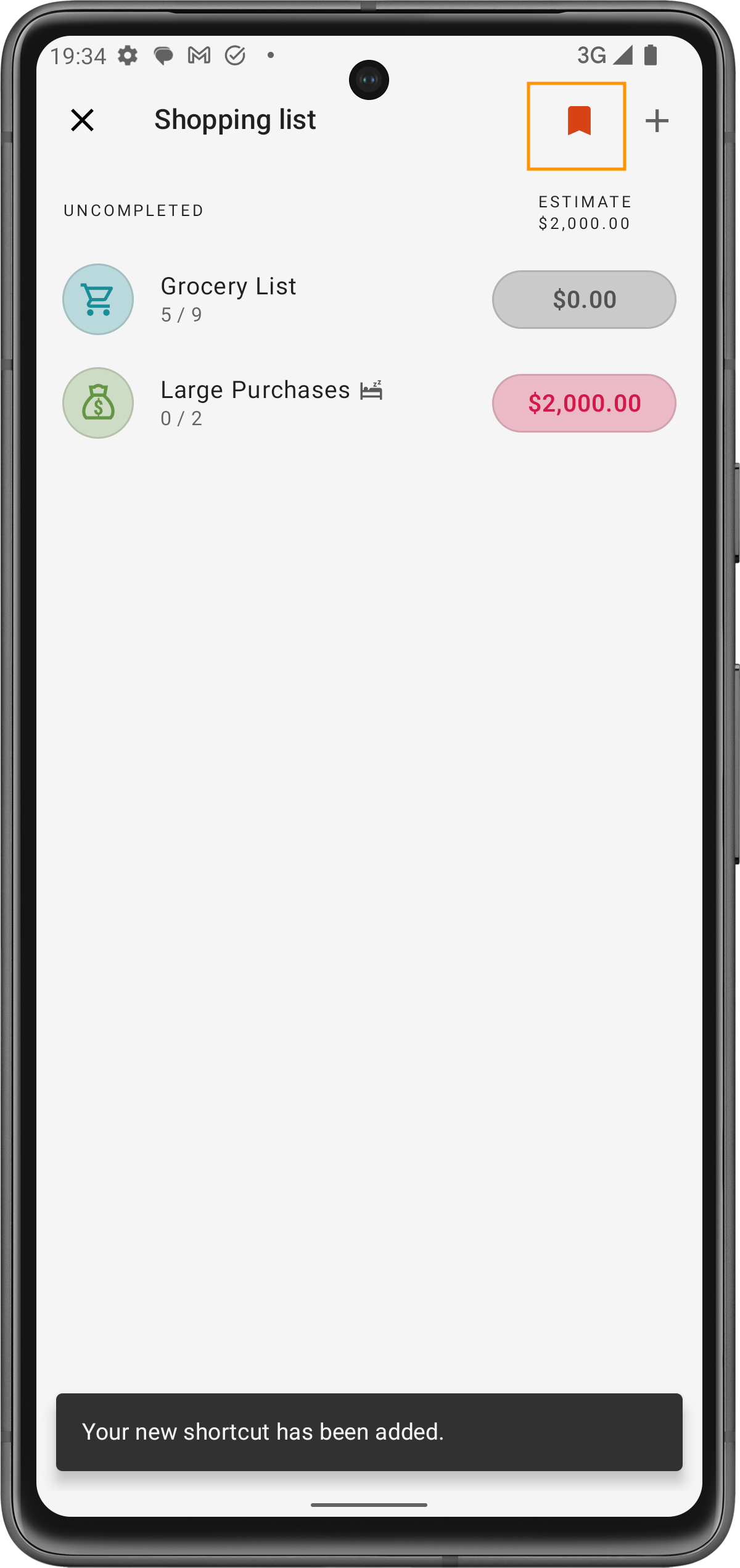 Una volta creata la lista della spesa, tocca l'icona del segnalibro nell'angolo in alto a destra per aggiungere una scorciatoia.