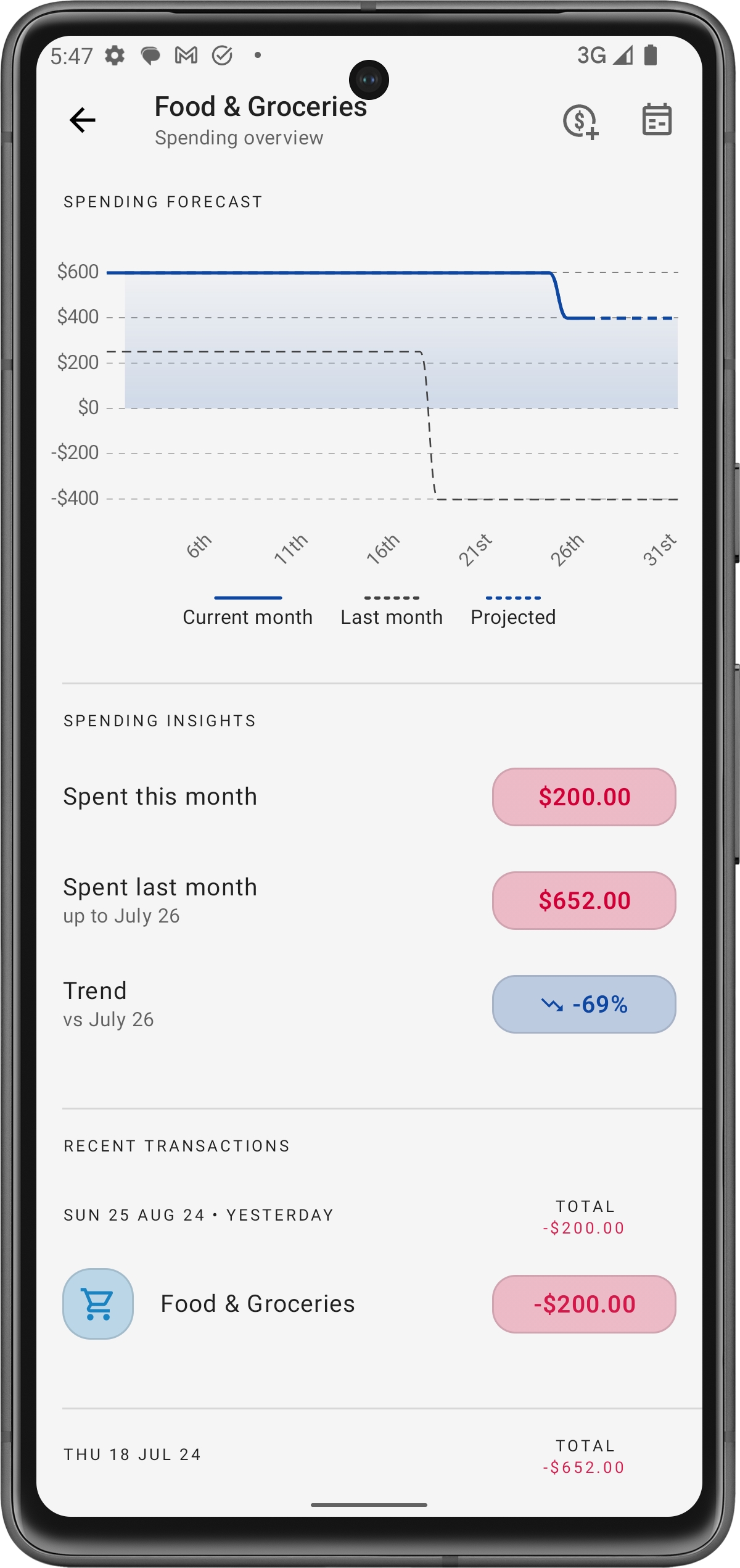 Visualizza una rappresentazione grafica delle tue tendenze di spesa per il mese corrente, confrontata con il mese precedente e con la spesa prevista per il resto del mese. Questa previsione ti aiuta a capire se sei in linea con il tuo budget o se è necessario apportare modifiche.