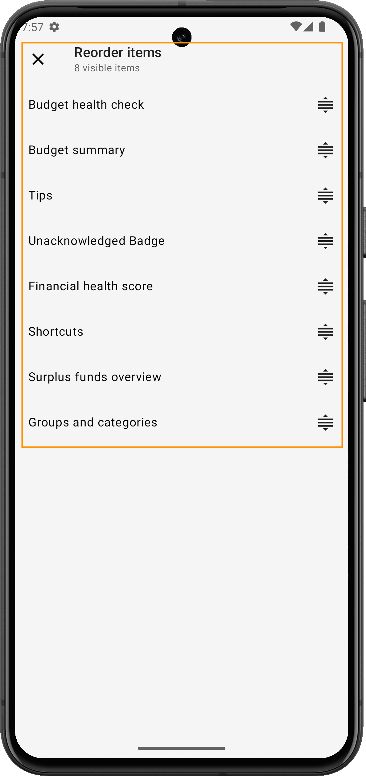 Tocca e tieni premuto l'icona accanto all'elemento che desideri spostare (tre linee orizzontali).