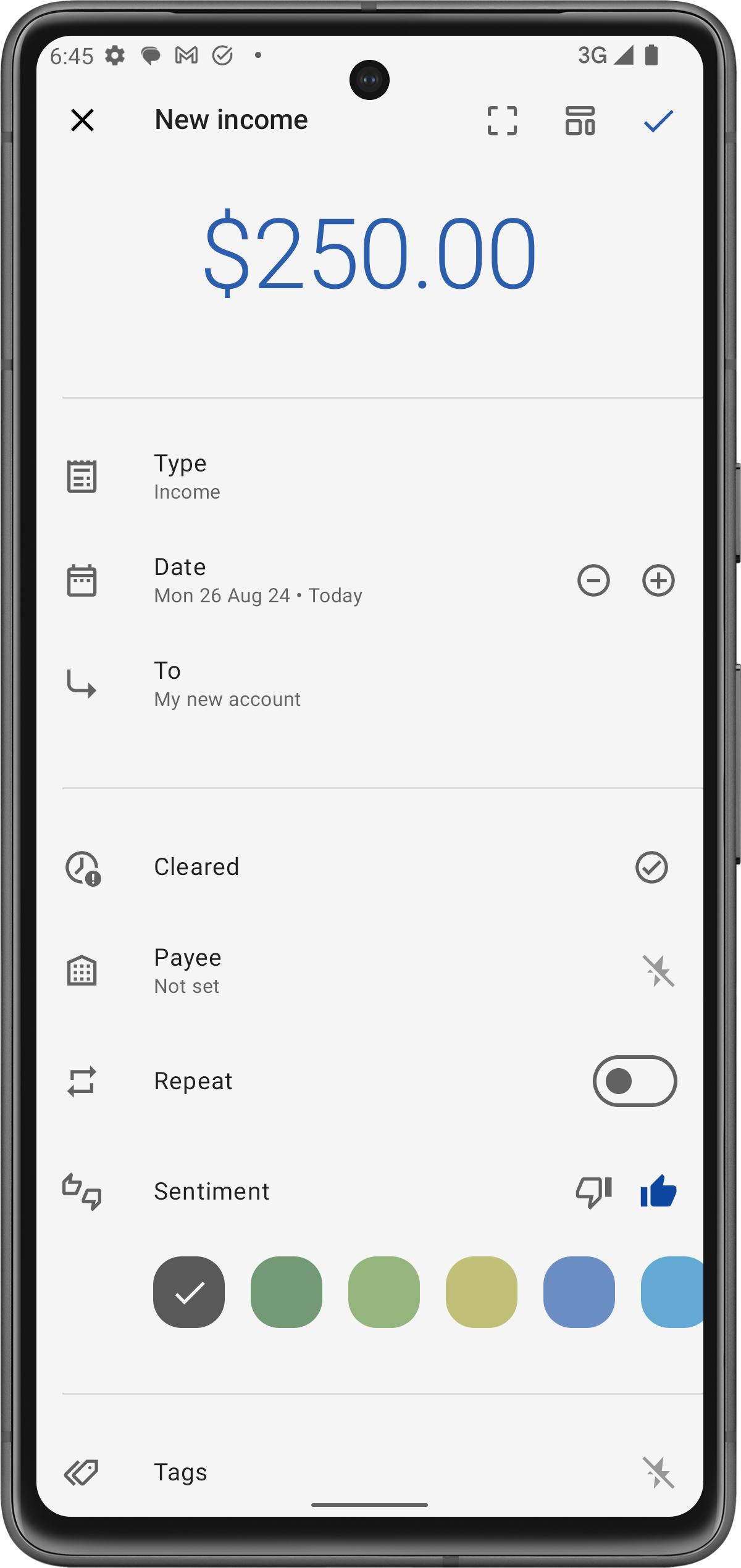 Non è necessario assegnare una categoria o specificare un conto "Da" per le transazioni di entrata. Registrando accuratamente dove viene depositato il tuo reddito, assicuri che il tuo budget rifletta la crescita dei fondi disponibili.