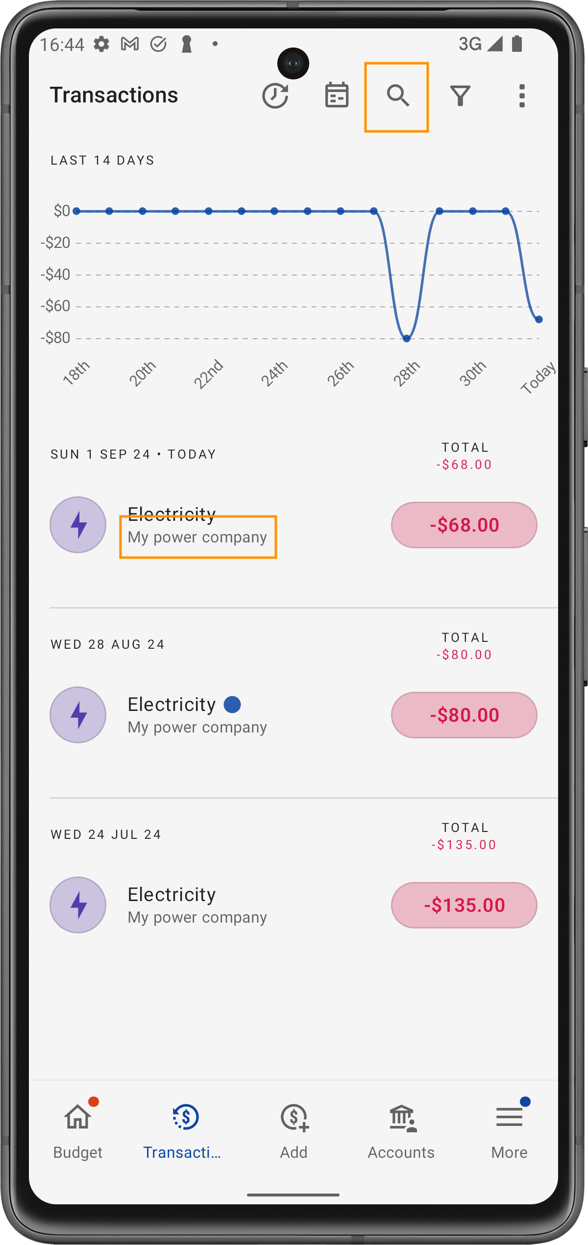 L'app dispone di una funzione intelligente, indicata dall'icona del fulmine, che rappresenta la capacità di suggerimento automatico dell'app. Nel tempo, l'app apprende i tuoi modelli di spesa, come le transazioni frequenti con determinati beneficiari, e suggerisce automaticamente questi beneficiari quando inserisci nuove spese. Questo ti fa risparmiare tempo e sforzo, rendendo il processo di registrazione delle transazioni più veloce ed efficiente. Ad esempio, se paghi regolarmente la compagnia elettrica, l'app inizierà a suggerire "La mia compagnia elettrica" ogni volta che registri una spesa correlata all'elettricità.