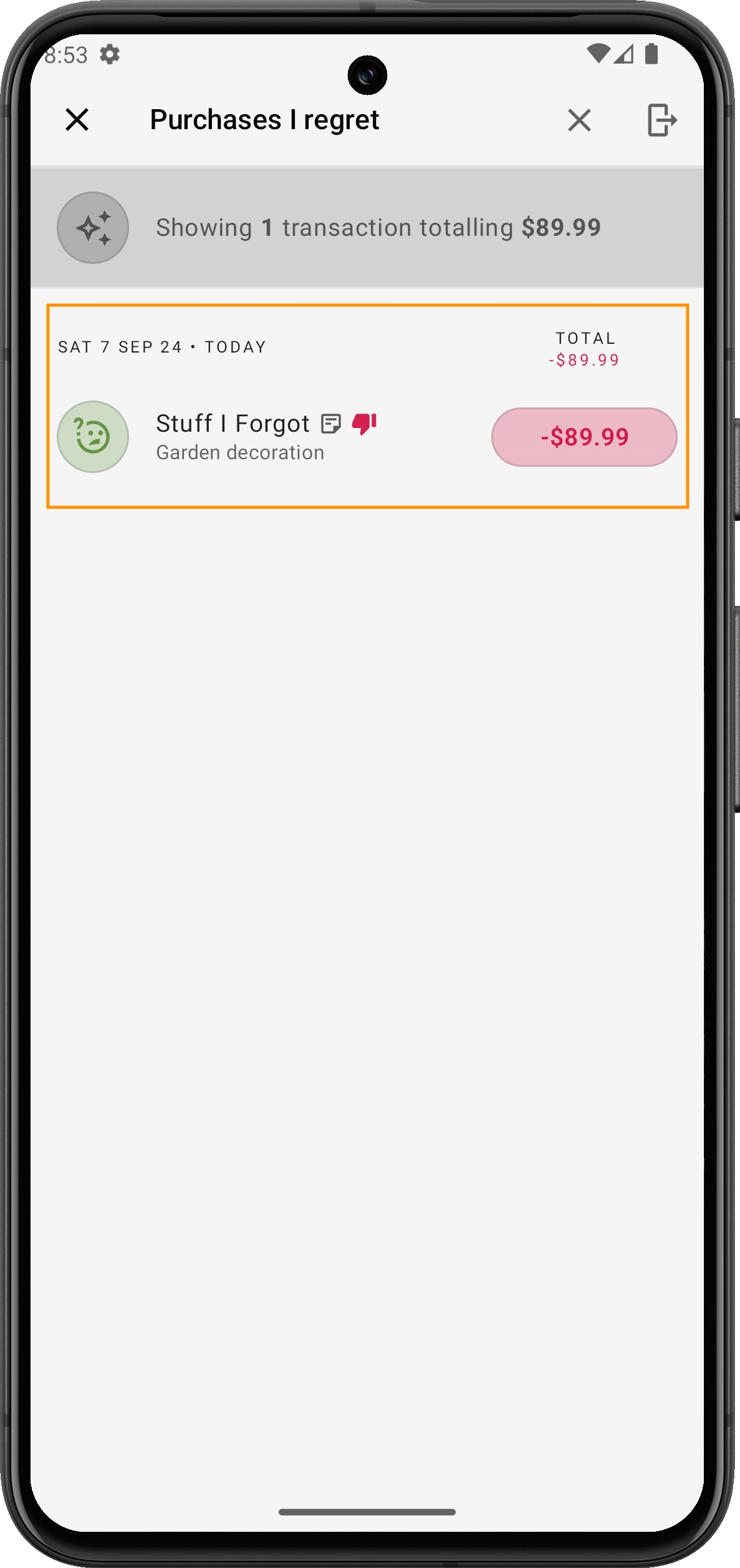 Se hai segnato una transazione come negativa (pollice verso il basso), Beyond Budget ti consente di rivedere rapidamente questi acquisti di cui ti penti.