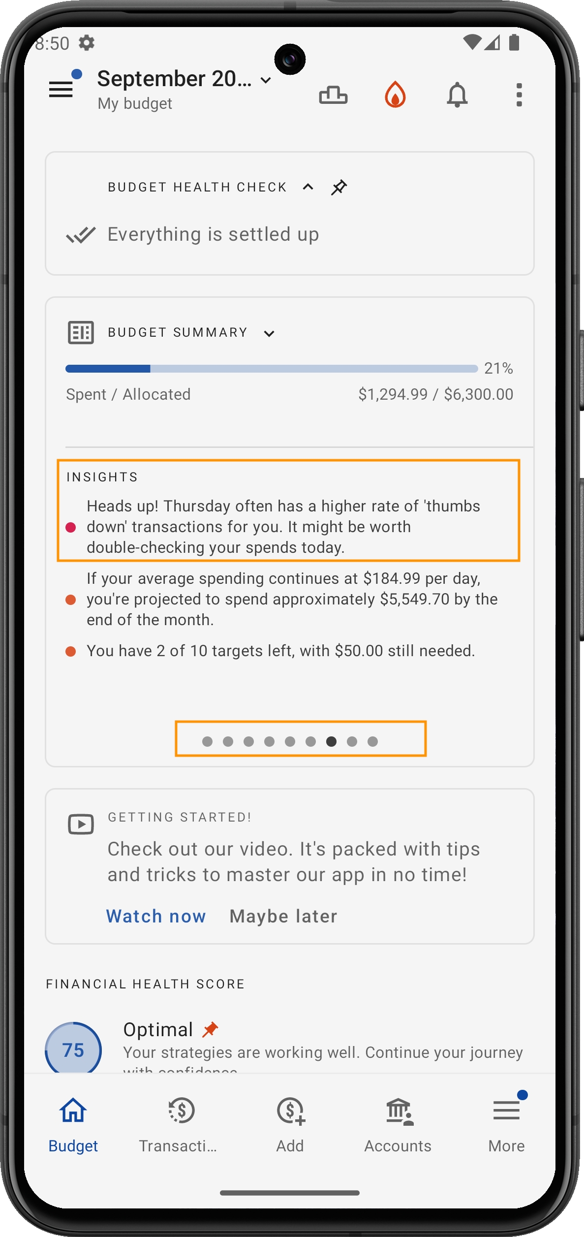 Riceverai approfondimenti personalizzati nel "Riepilogo del Budget". Questi approfondimenti ti aiutano a identificare modelli, come quando certi giorni (ad es. giovedì) tendono ad avere più transazioni con "pollice verso il basso", spingendoti a rivedere le tue abitudini di spesa in quei giorni.