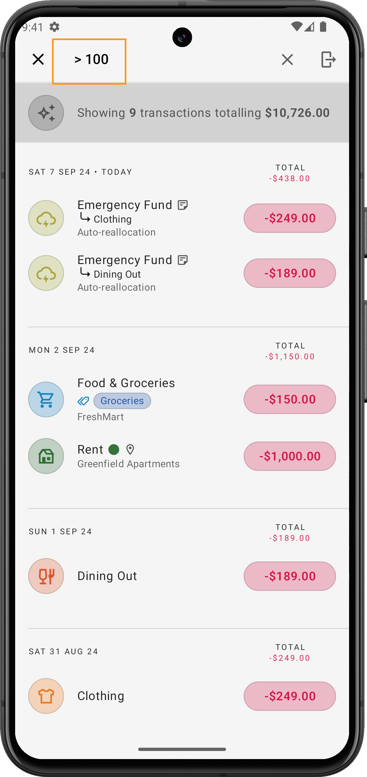 Invece di scorrere lunghe liste di transazioni, puoi trovare esattamente ciò che ti serve in pochi secondi con la Ricerca Intelligente. Che tu stia cercando le spese "dello scorso weekend" o tutti gli acquisti sopra $200, ottieni risultati immediati con pochi tocchi.