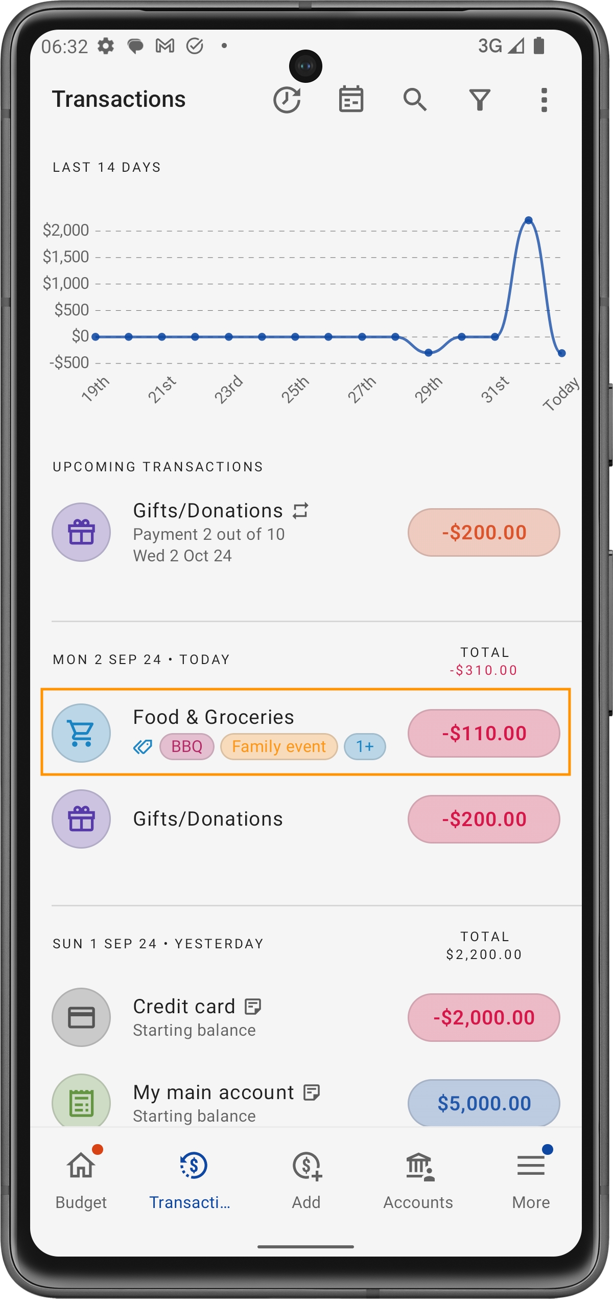 Caso d'uso: Questo è utile per rivedere rapidamente le tue ultime attività. Ad esempio, dopo aver taggato un acquisto come BBQ, puoi immediatamente vederlo nell'elenco delle transazioni recenti per assicurarti che tutto sia stato categorizzato correttamente.