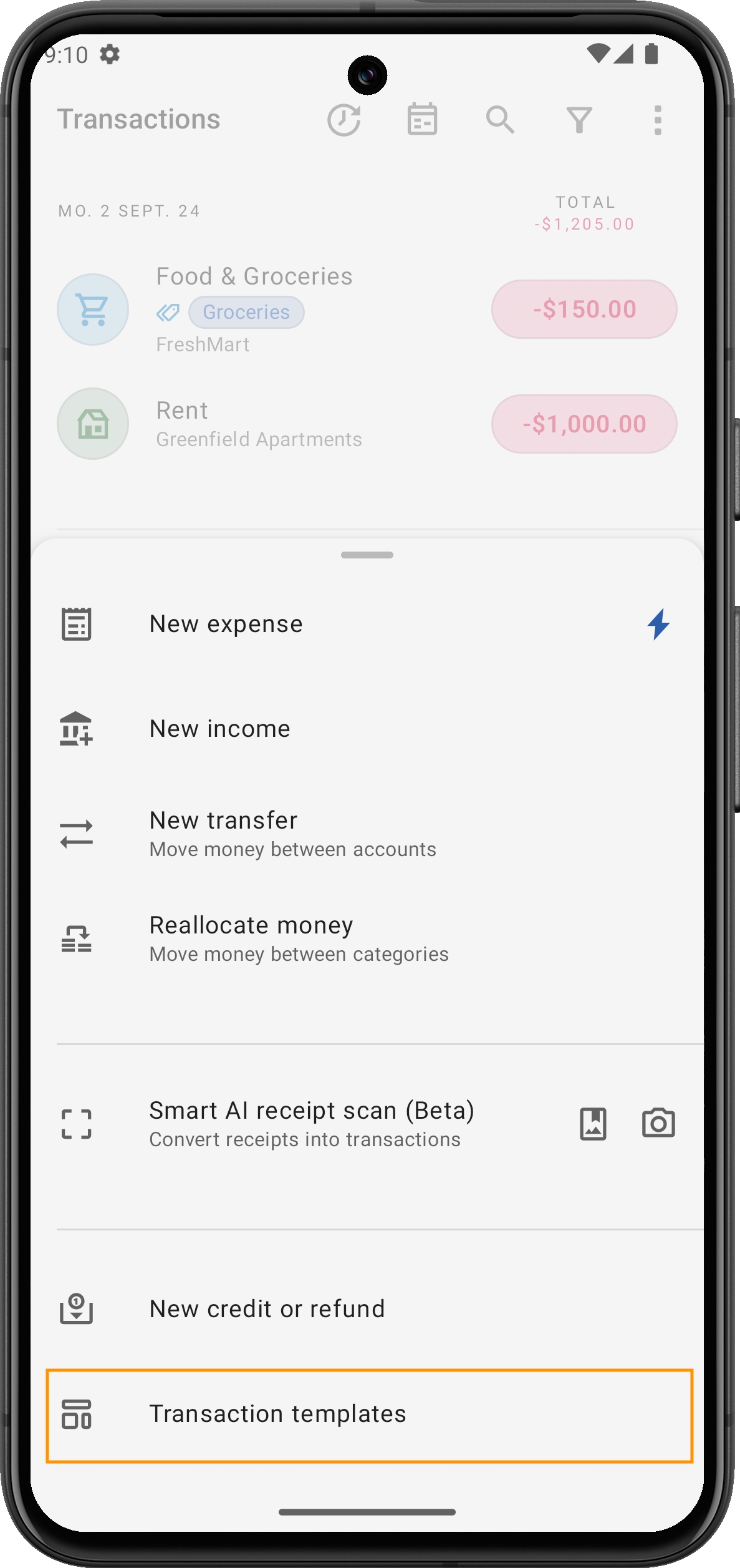I modelli di transazione sono una funzione pratica che ti consente di creare transazioni usate frequentemente e salvarle per un accesso rapido successivo. Che si tratti di pagamenti regolari o entrate, come l'affitto, la spesa o gli abbonamenti mensili, i modelli ti permettono di replicare queste transazioni con il minimo sforzo.