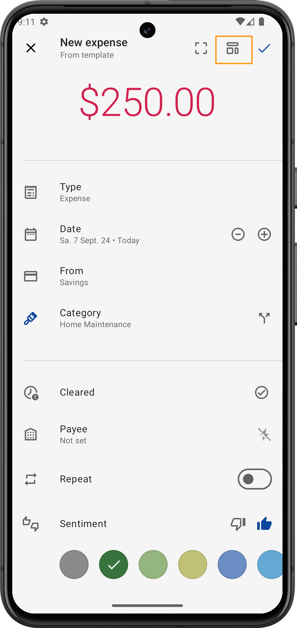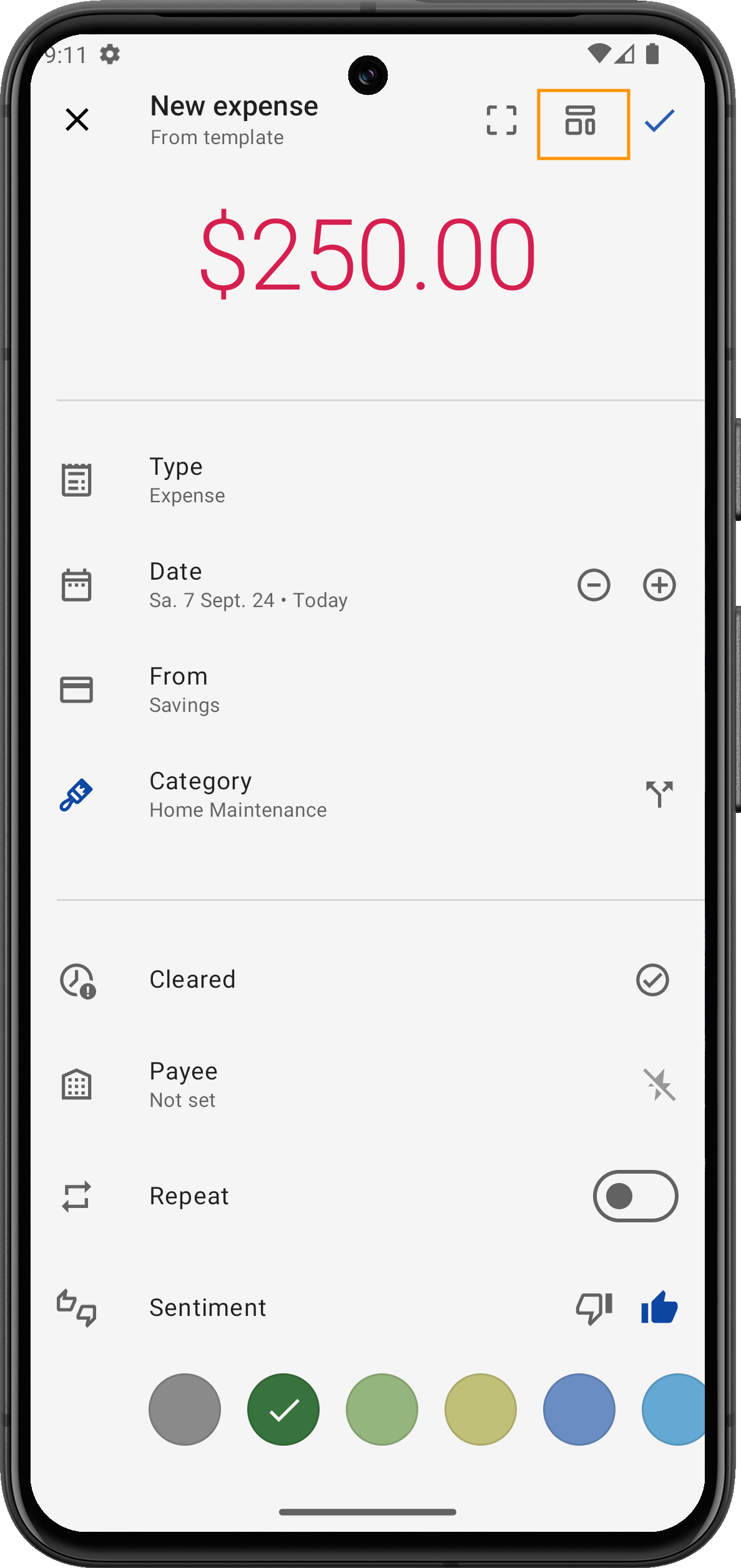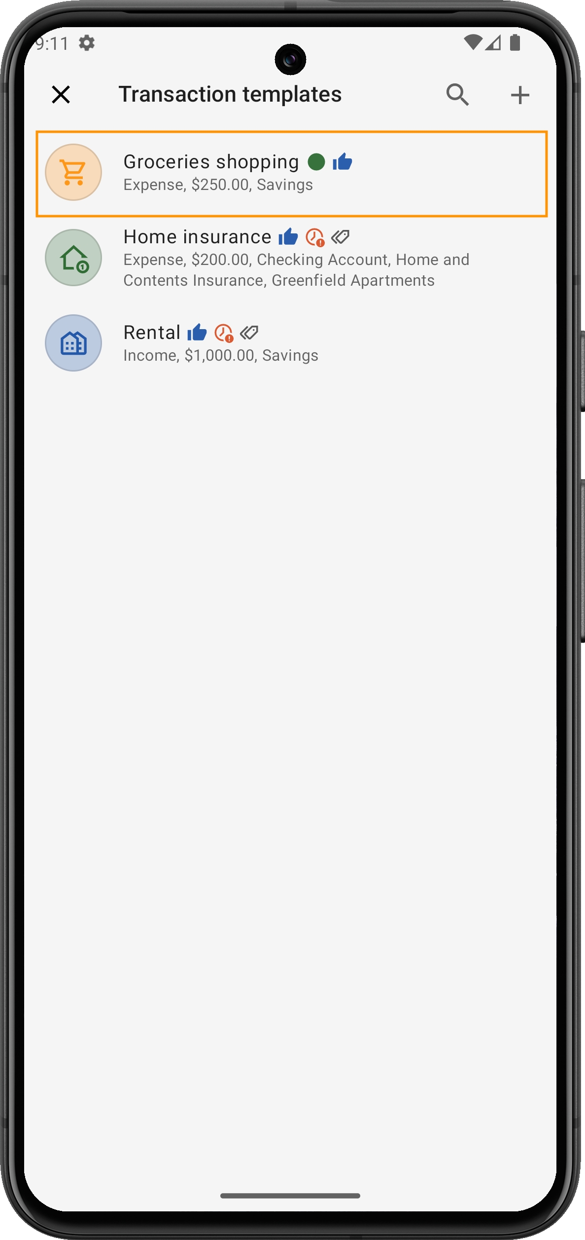 Entrate da affitto: Se ricevi entrate regolari come l'affitto, questo modello popolerà automaticamente i campi necessari per una transazione di entrata, facendoti risparmiare tempo.