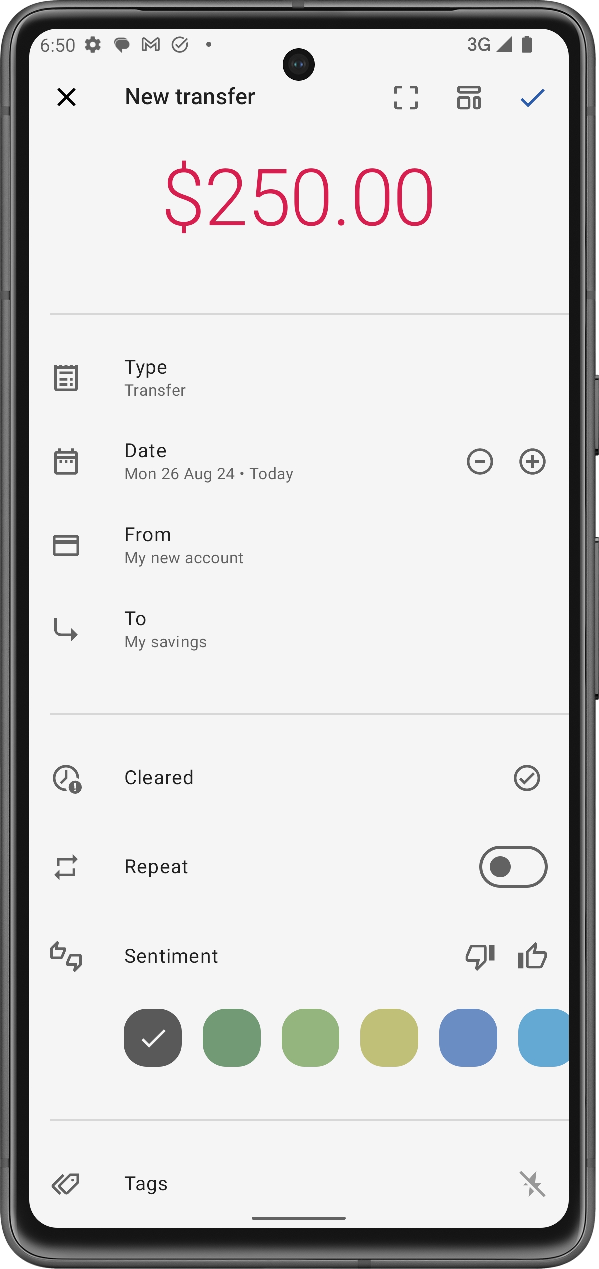 Poiché i trasferimenti comportano lo spostamento di denaro tra i propri conti, non è necessario assegnare un beneficiario. Questo tipo di transazione è particolarmente utile per azioni come il pagamento del saldo della carta di credito o lo spostamento di fondi tra conti per scopi di budgeting.