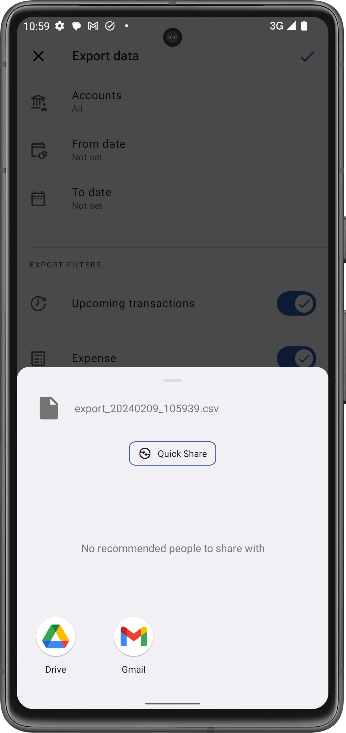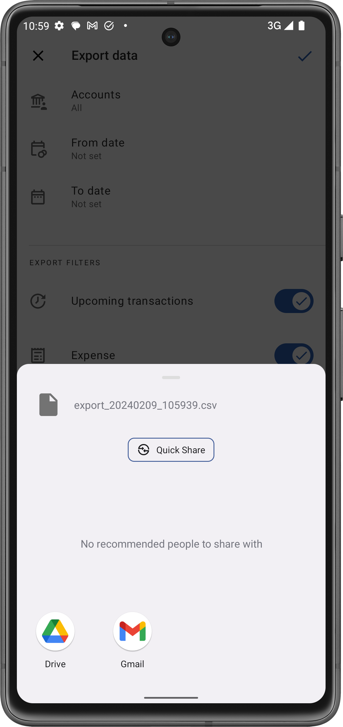.csvcon i tuoi dati.Avrai quindi diverse opzioni per condividere questo file, come tramite Drive o Gmail.