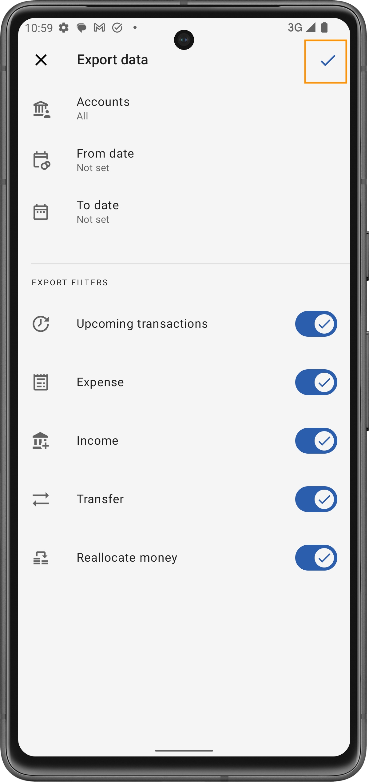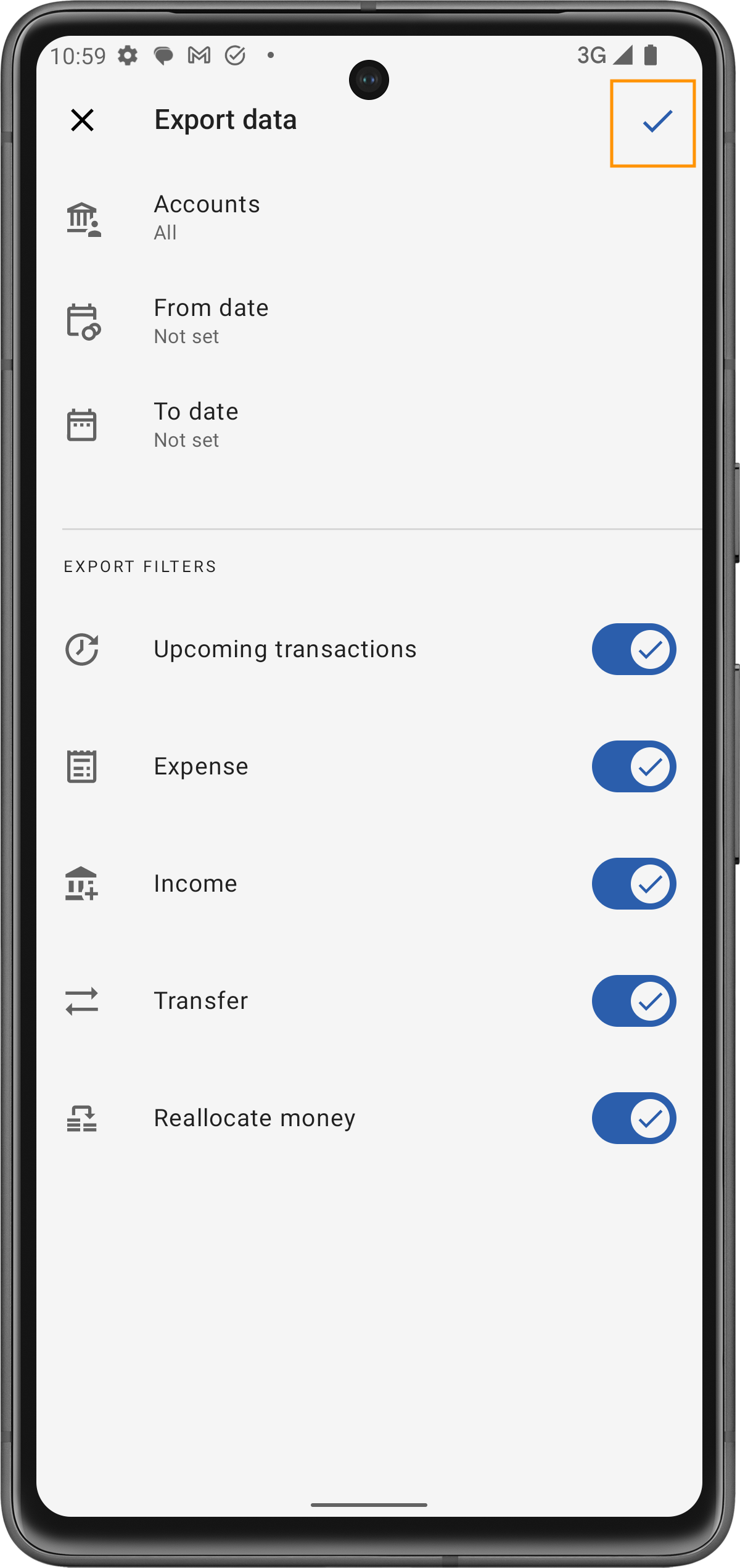 Una volta configurate le impostazioni di esportazione, tocca il segno di spunta nell'angolo in alto a destra dello schermo per avviare l'esportazione.