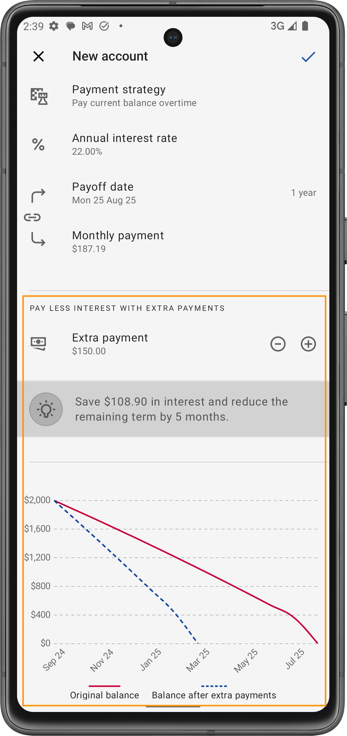 Sua estratégia de pagamento selecionada orienta como o aplicativo gerencia sua dívida de cartão de crédito: