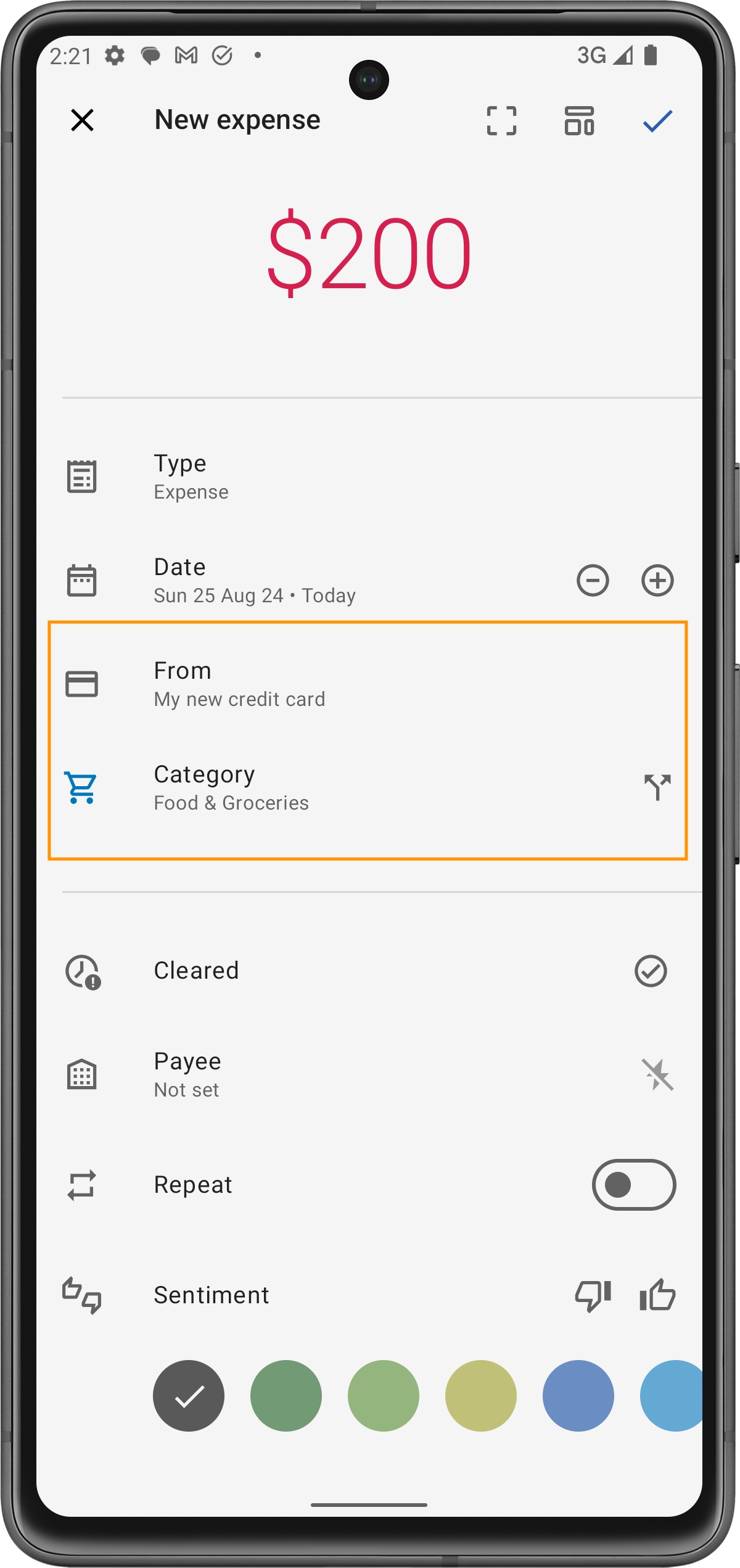 Depois de configurar sua conta de cartão de crédito, o aplicativo cria uma categoria especial especificamente para os pagamentos de cartão de crédito. Qualquer despesa feita com o cartão será movida de suas categorias respectivas para essa categoria de cartão de crédito até que o saldo seja pago.