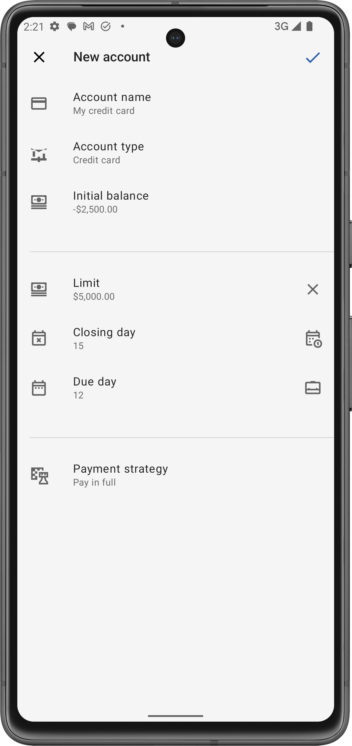 Insira o Saldo e Detalhes: Insira o saldo atual (geralmente um número negativo, representando a dívida). Você também pode definir campos opcionais como limite de crédito, data de vencimento e data de fechamento, o que ajudará o aplicativo a gerenciar seus pagamentos.
