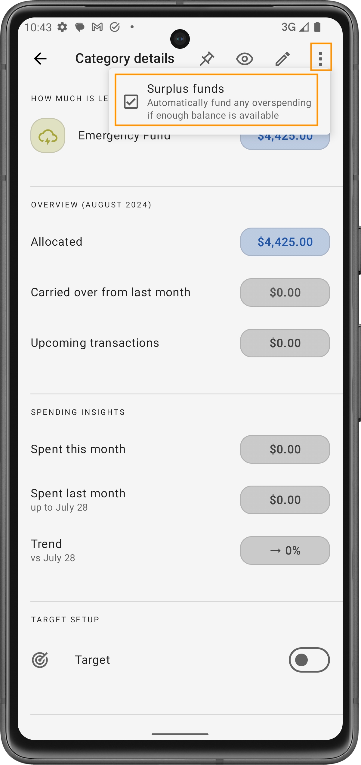 Para começar, você precisará designar uma categoria como seu Fundo Excedente. Isso pode ser feito nos detalhes da categoria: