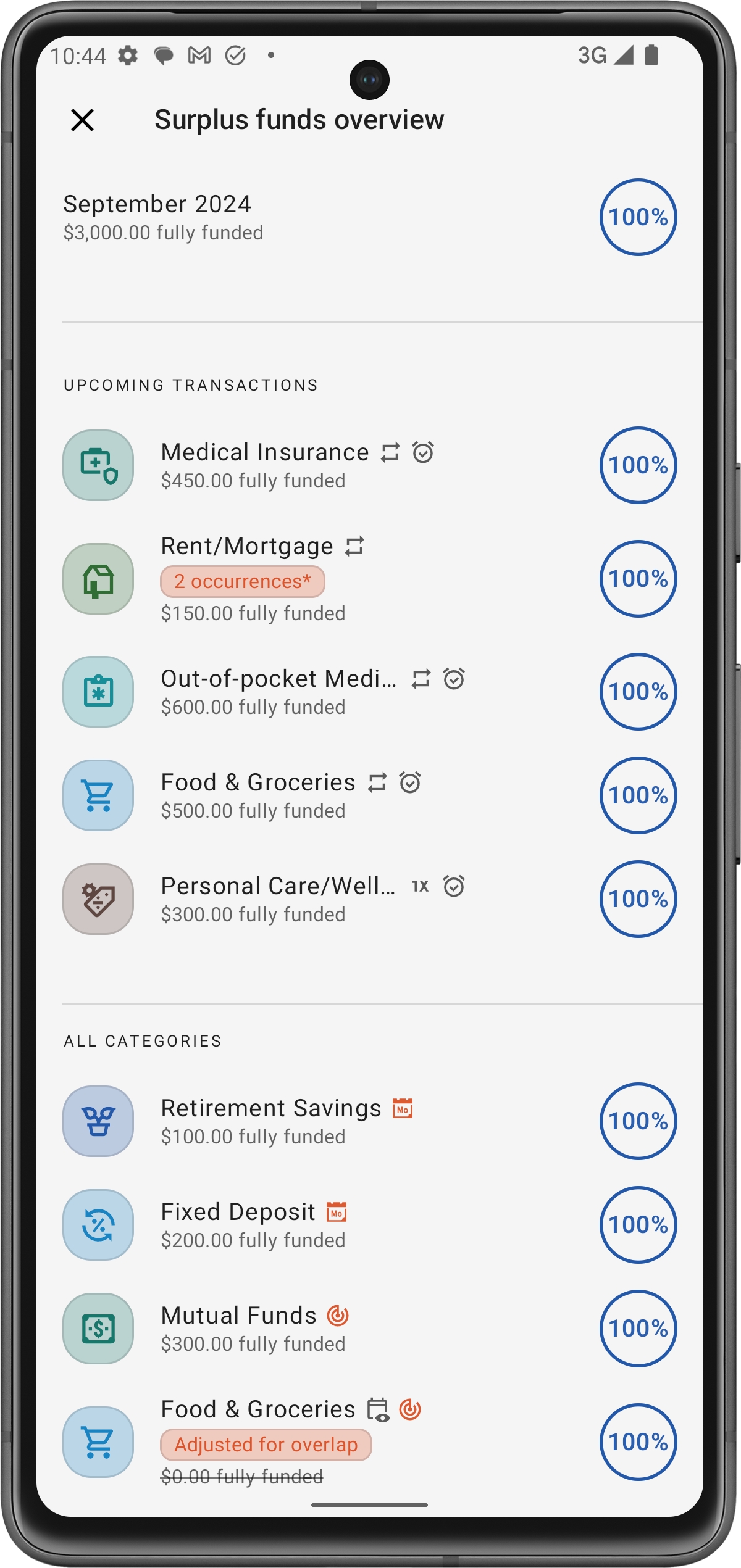A Visão Geral de Fundos Excedentes é uma ferramenta crucial no nosso app, que capacita os usuários a gerenciar eficazmente qualquer fundo excedente, alocando-os estrategicamente para pagamentos futuros e metas financeiras. Esse recurso fica disponível quando você designa uma categoria específica como "Fundos Excedentes" nos detalhes da categoria. Abaixo, vamos explicar como os fundos excedentes são gerenciados, como o excesso de gastos é automaticamente coberto e como você pode utilizar a ferramenta de previsão para planejar adiante.