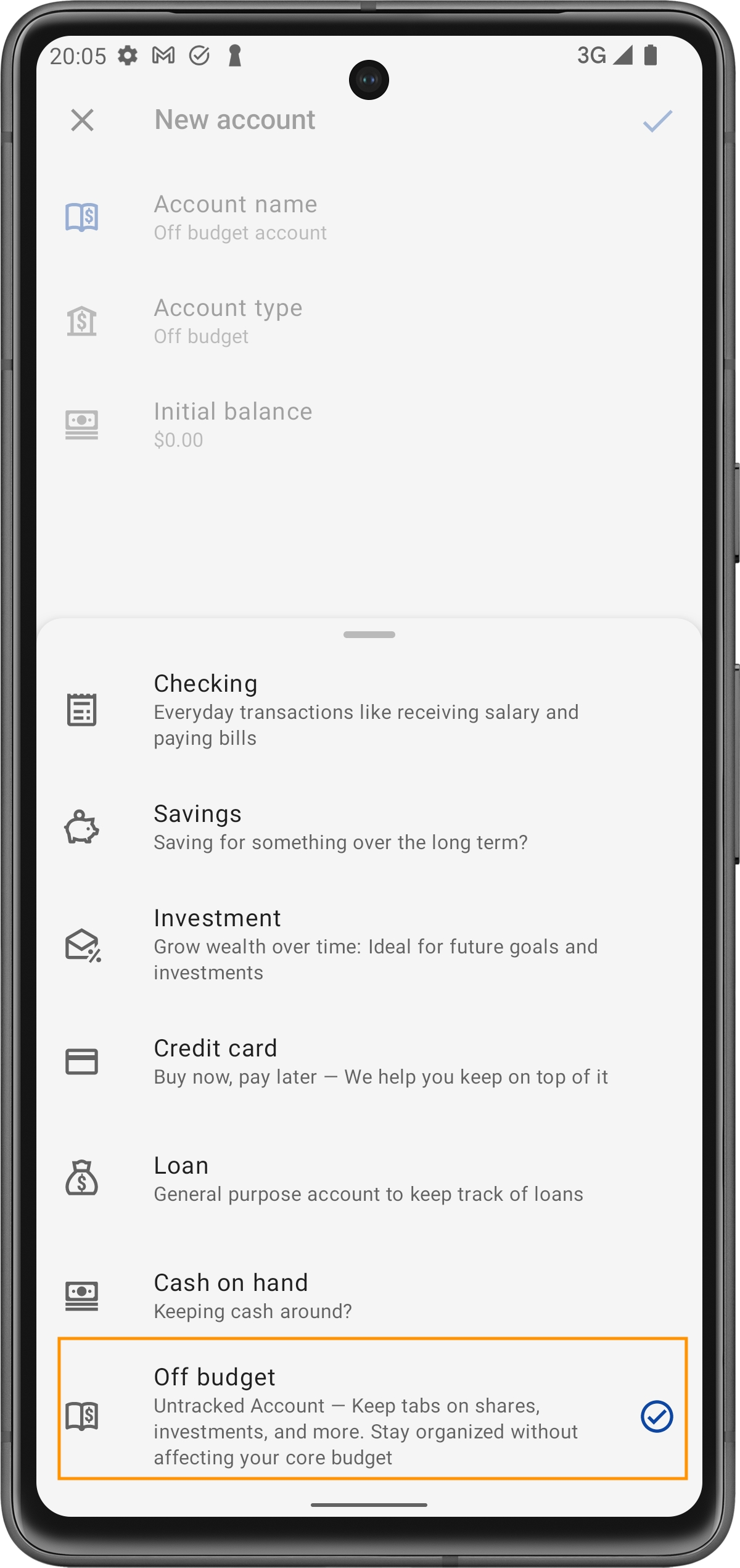 Tipo de Conta, escolha "Fora do Orçamento."Nomeie a Conta: Insira um nome descritivo (ex.: "Fundo de Emergência").