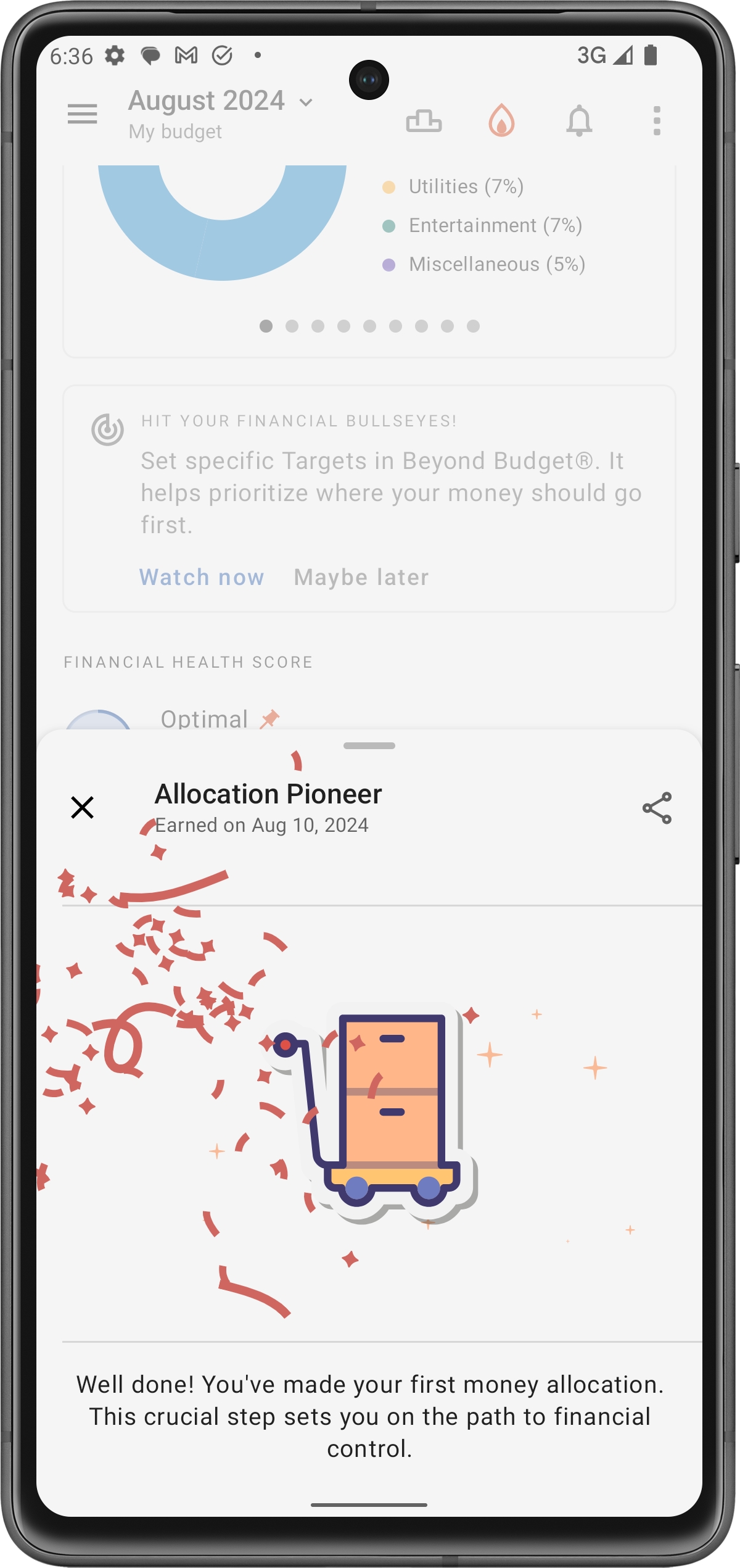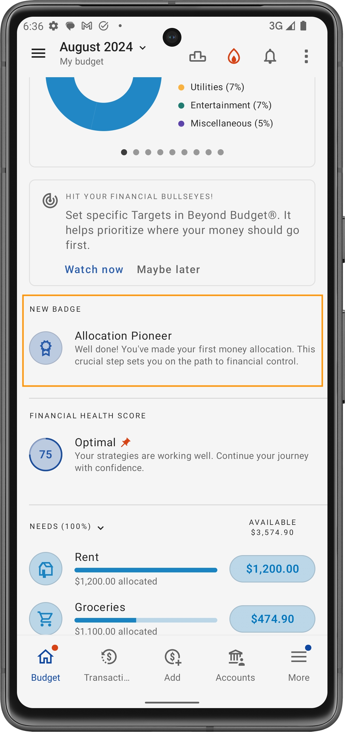 Sabemos que manter a disciplina financeira pode, às vezes, parecer uma tarefa árdua. É por isso que adicionamos as Insígnias (além de muitos outros recursos de gamificação) — um sistema de recompensas projetado para tornar o orçamento divertido e motivador. Esses recursos proporcionam reconhecimento pelo seu esforço e ajudam a construir hábitos financeiros positivos ao longo do tempo.