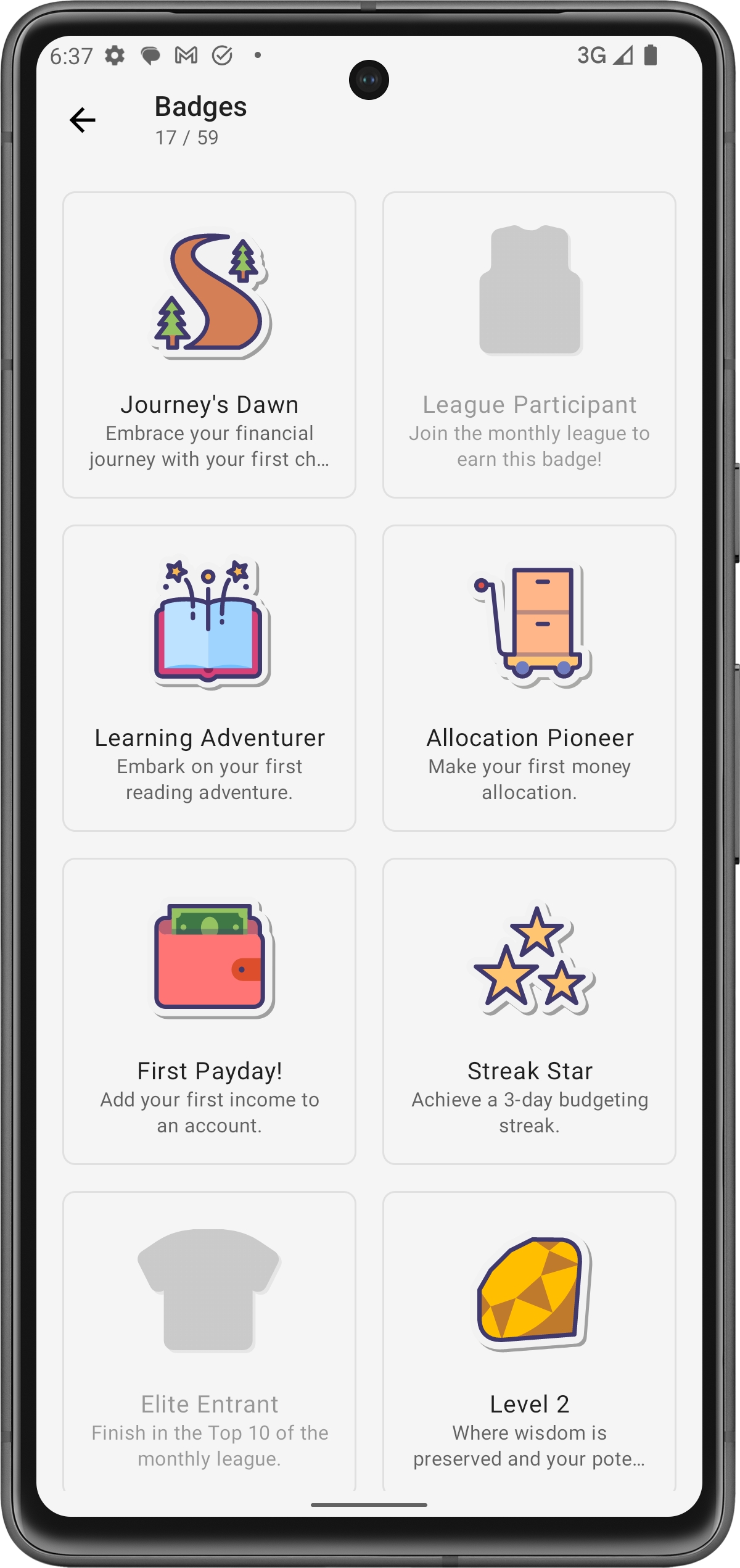 Essas insígnias são criadas para celebrar seu progresso, destacar aspectos importantes do orçamento e manter você engajado com o app. Elas são divididas em 5 níveis, de conquistas fáceis até as lendárias. Ao desbloquear essas insígnias, você não apenas acompanhará sua evolução, mas também sentirá a satisfação de avançar do básico para o nível de especialista em finanças.