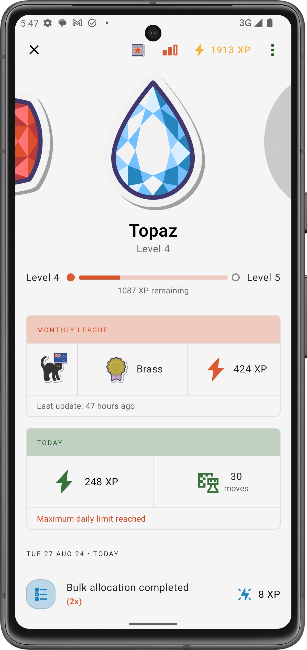 O recurso de níveis no app não é apenas um sistema de pontos—é uma experiência totalmente imersiva, projetada para tornar o gerenciamento de orçamento recompensador e divertido. O app transforma tarefas financeiras cotidianas em um jogo dinâmico, onde cada ação que você realiza lhe concede XP (Pontos de Experiência) e faz você avançar por níveis, representados por minerais, joias e pedras preciosas. Cada novo nível simboliza um domínio maior dos seus hábitos financeiros.