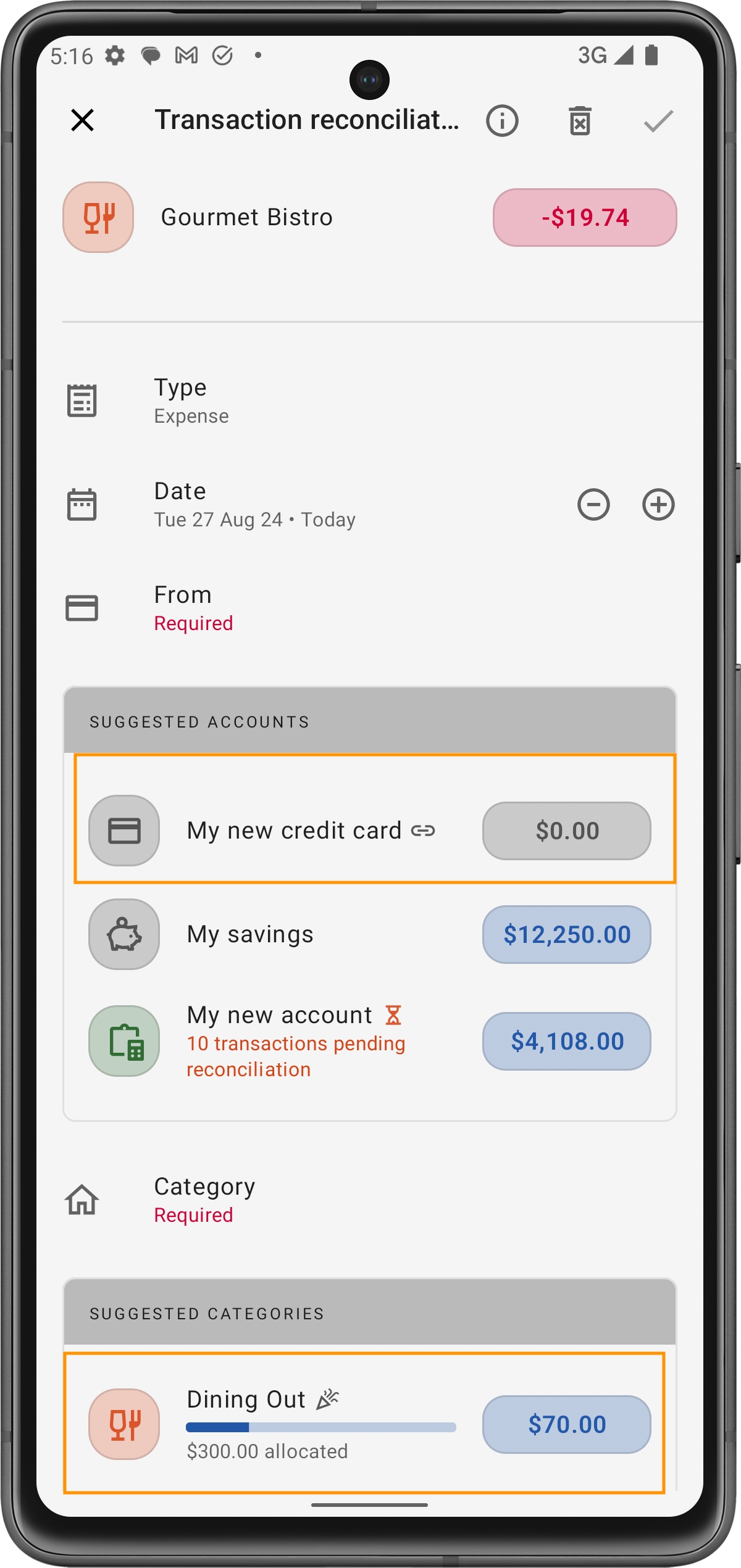 Processamento com IA: Utilizando inteligência artificial de ponta, o app extrai informações como valor, comerciante e data da transação. Ele também sugere automaticamente categorias e contas relevantes com base nos detalhes da transação.