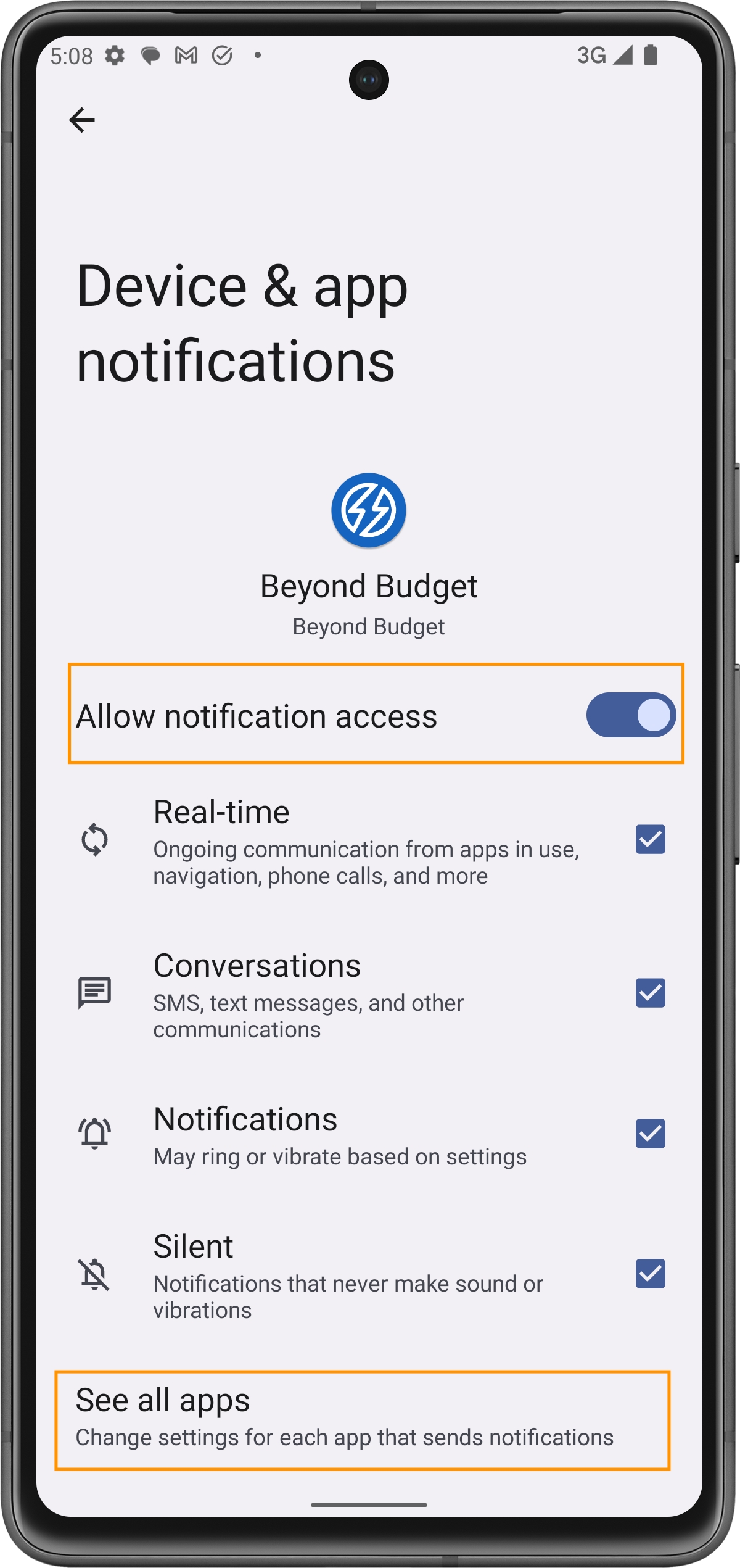 Isso o levará para as configurações do sistema Android, onde você pode conceder permissão para que o app acesse suas notificações. Uma vez ativado, o app começará a monitorar suas notificações de transações financeiras para registrá-las automaticamente.