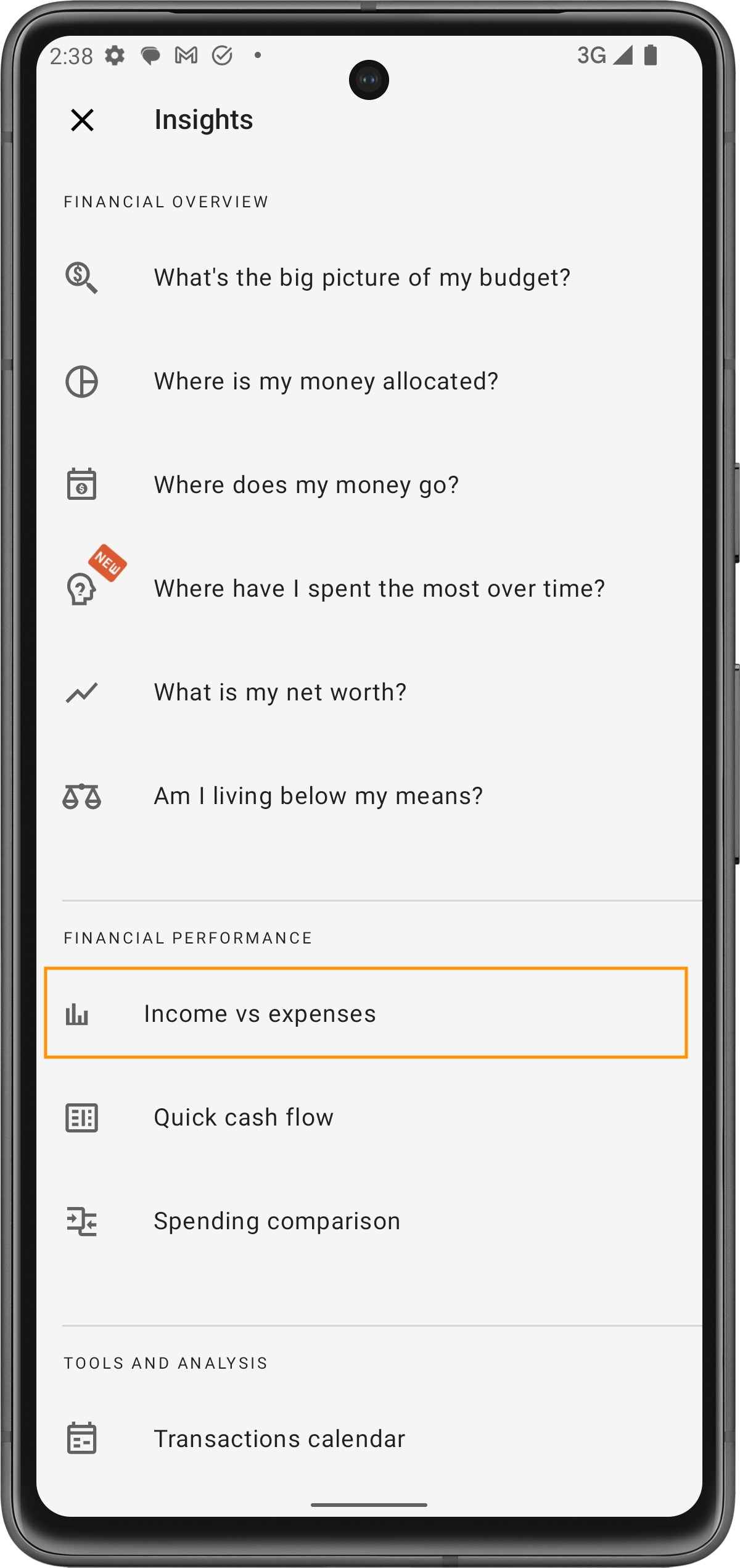 O insight "Renda vs Despesas" oferece uma visão clara de como sua renda se compara aos seus gastos ao longo de um período selecionado, ajudando você a monitorar o fluxo de caixa e a gerenciar suas finanças de forma eficaz.
