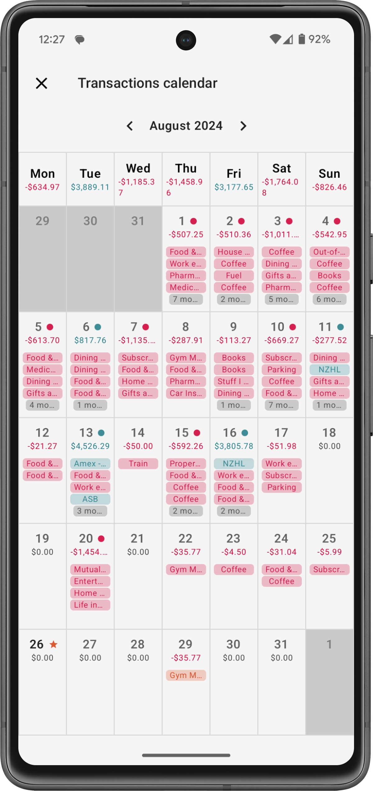 Tendências Mensais: Ao visualizar suas finanças em um formato de calendário, você pode identificar tendências nos seus hábitos de gastos ao longo do mês, como dias específicos em que os gastos são maiores ou quando os pagamentos recorrentes são feitos.