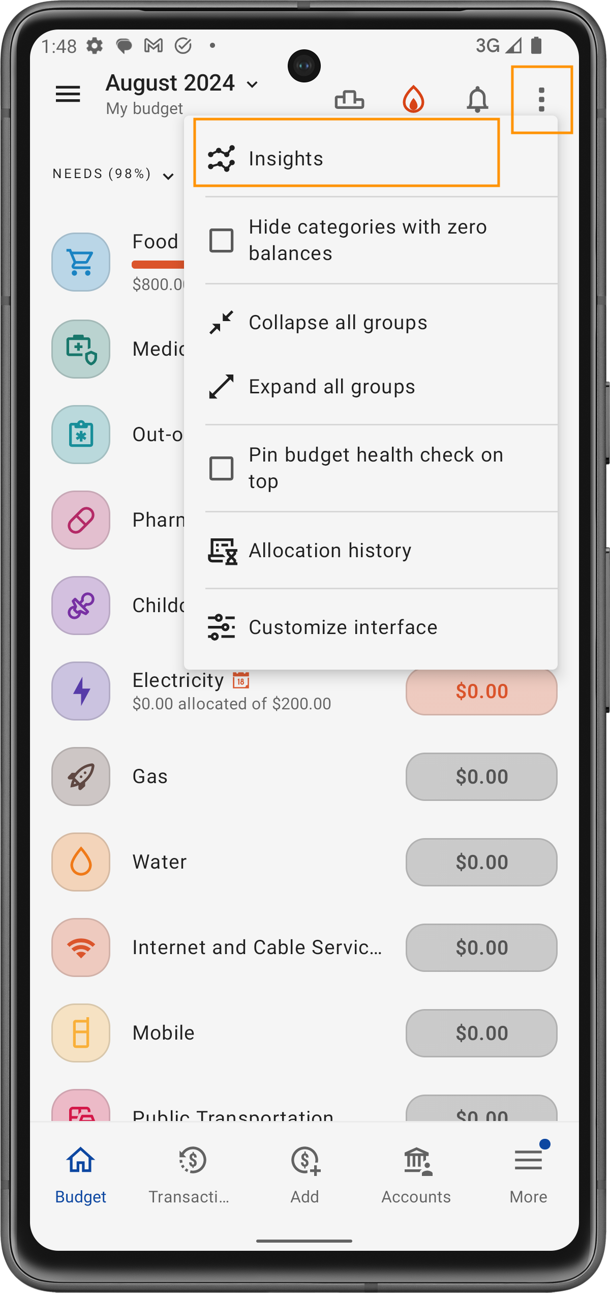 Insights: Esta seção oferece observações específicas sobre seu orçamento atual. Por exemplo: