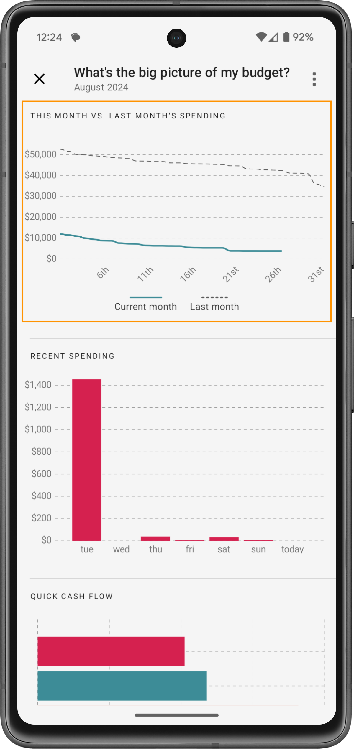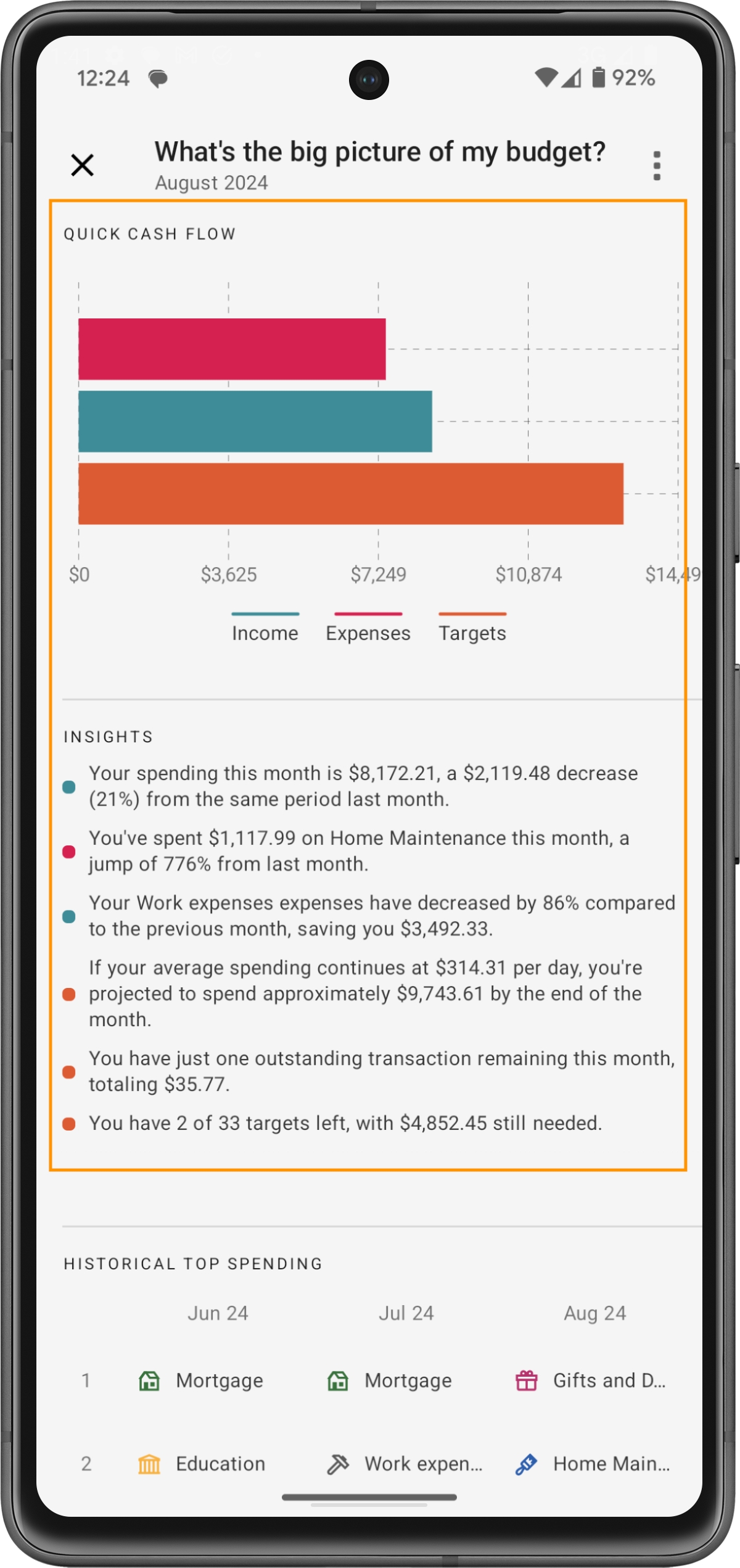 O insight "Qual é a visão geral do meu orçamento?" oferece uma visão abrangente das suas finanças, detalhando como seu dinheiro está sendo alocado, gasto e economizado. Ele utiliza gráficos simples e visuais para ajudá-lo a entender seu orçamento rapidamente.