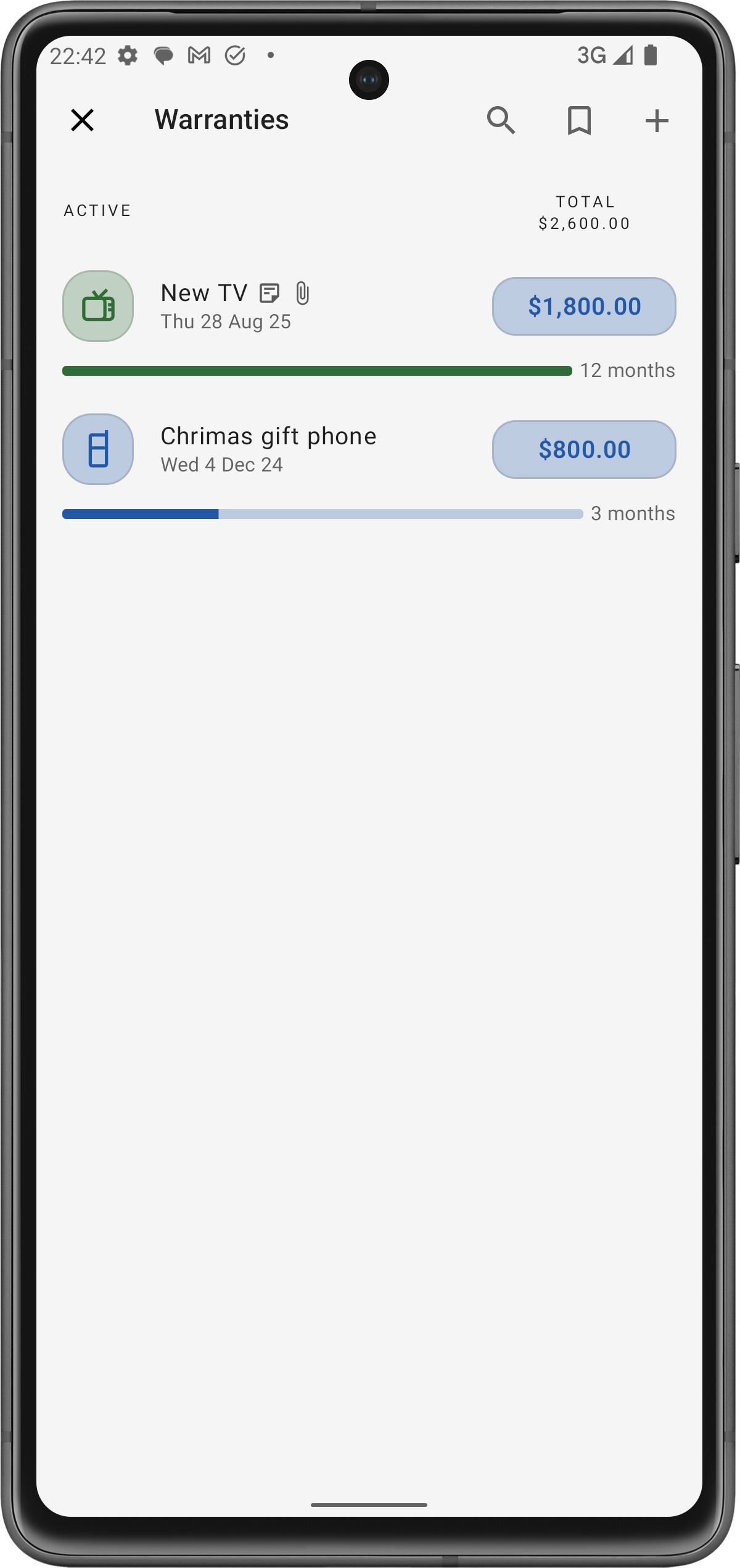 Uma vez adicionadas, suas garantias serão exibidas na tela principal com uma contagem regressiva mostrando quantos dias ou meses faltam até expirar. Esse lembrete visual ajuda você a ficar atento sem precisar verificar cada garantia manualmente.