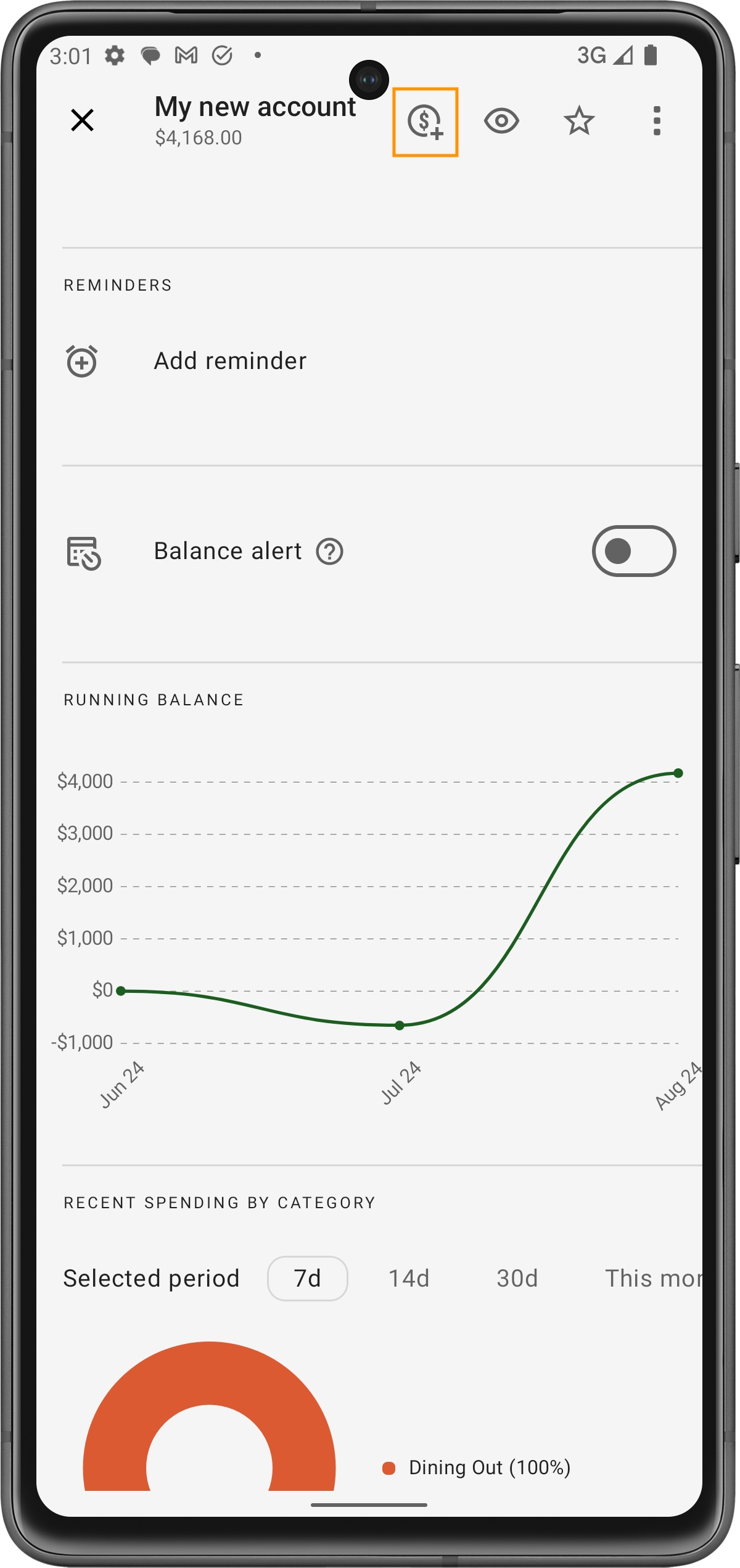 Ao rolar pela tela da conta, o ícone de transação (representado por um sinal de mais no topo da tela) aparecerá. Tocar nesse ícone abrirá uma janela de entrada de transação com a conta automaticamente pré-selecionada, simplificando o seu fluxo de trabalho.