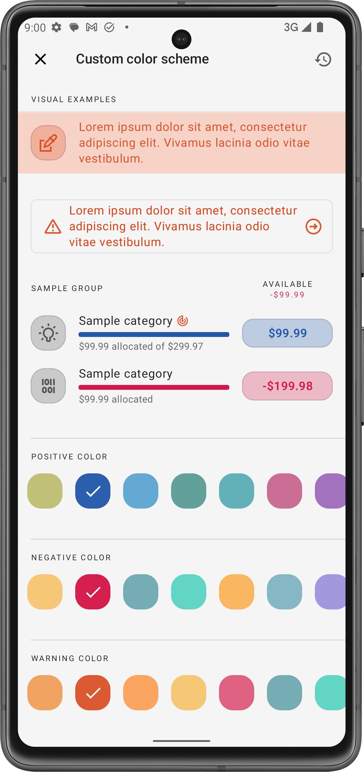 Além das predefinições padrão, o app oferece uma variedade de esquemas de cores exclusivos para usuários Pro. Essas opções extras adicionam mais variedade e estilo à sua experiência de orçamento, com paletas únicas que tornam o app verdadeiramente seu.