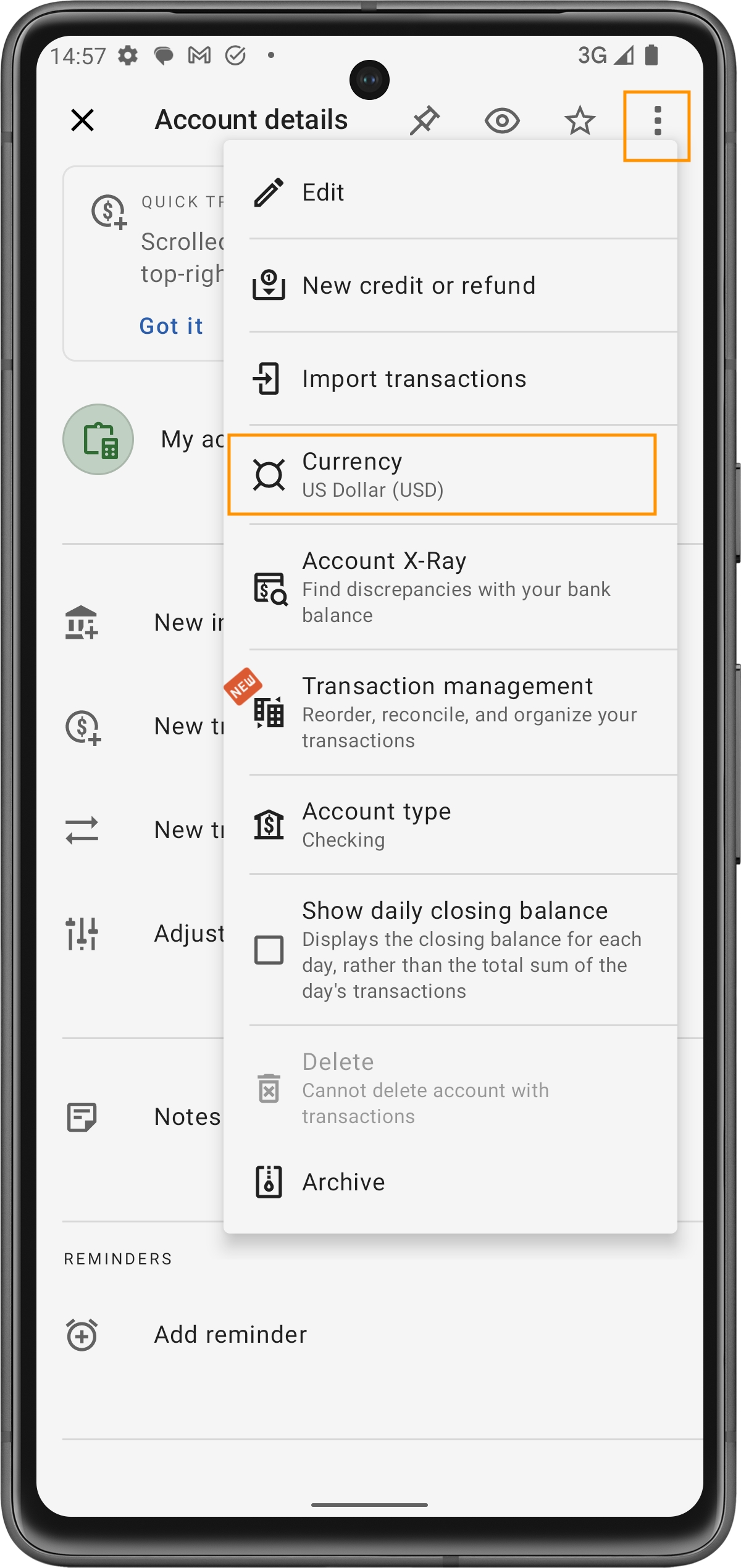 O app oferece flexibilidade no gerenciamento de diferentes moedas, sendo ideal para usuários com finanças internacionais. Você pode configurar diferentes moedas para contas individuais. No entanto, observe que atualmente não há recurso de conversão automática de câmbio (FX) dentro do app. Isso significa que o app não converte automaticamente entre moedas ao transferir fundos entre contas.