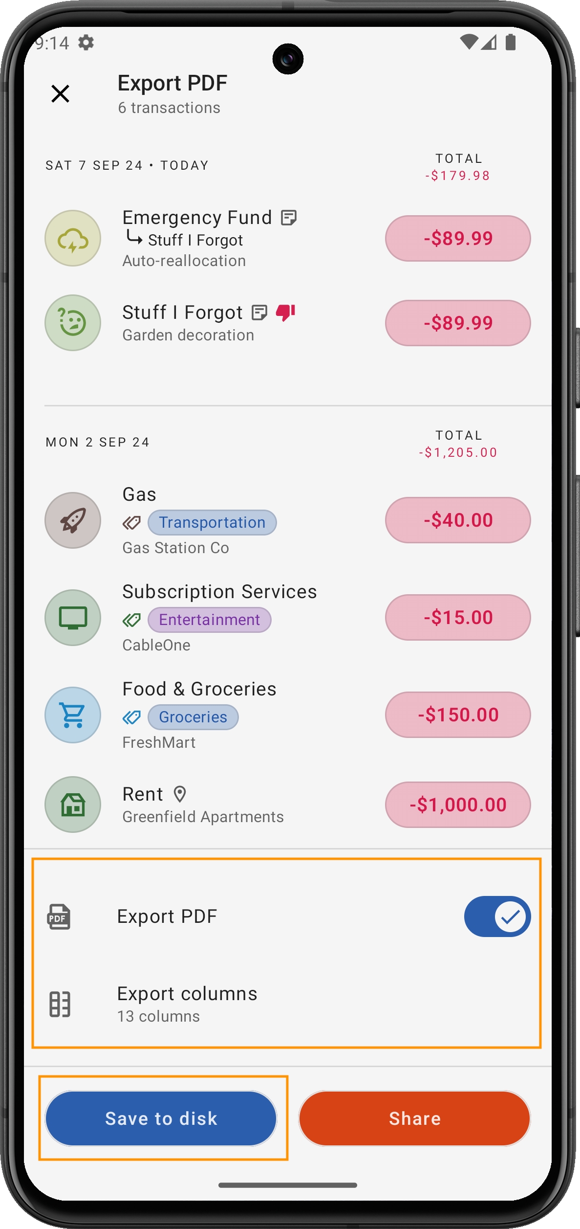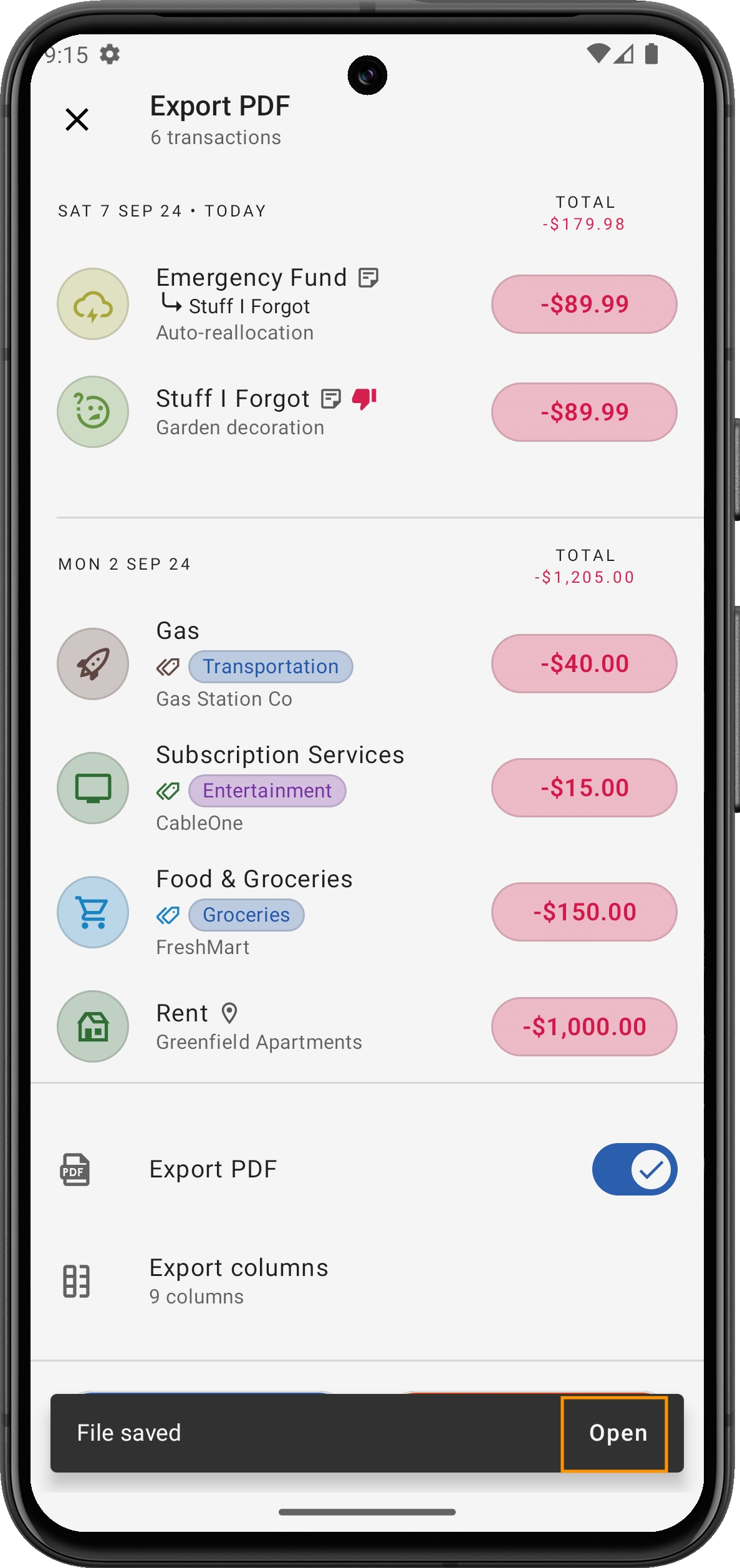 Exportações em PDF: Ideais para uma visualização rápida dos seus gastos, essas exportações incluem os detalhes das transações conforme exibidos no aplicativo, facilitando o compartilhamento com um consultor ou para arquivamento.