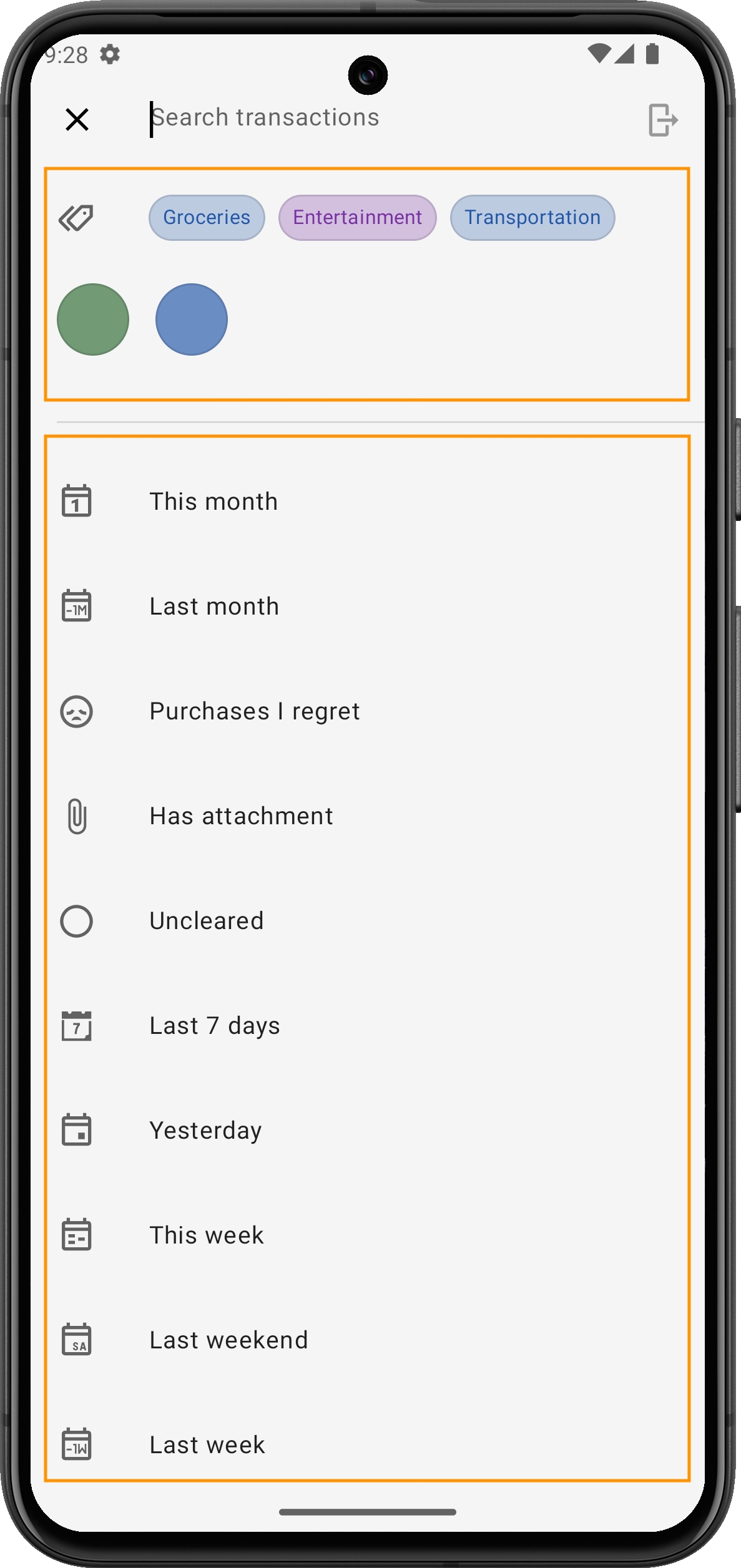 Quando você busca por transações, o aplicativo exibirá automaticamente as tags e cores usadas nessas transações no topo, para facilitar o filtro e acesso rápido!