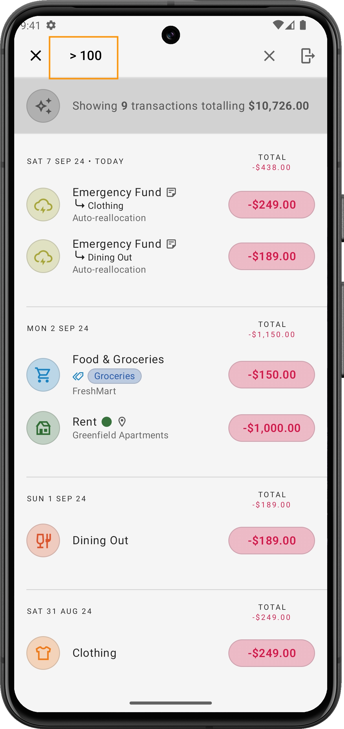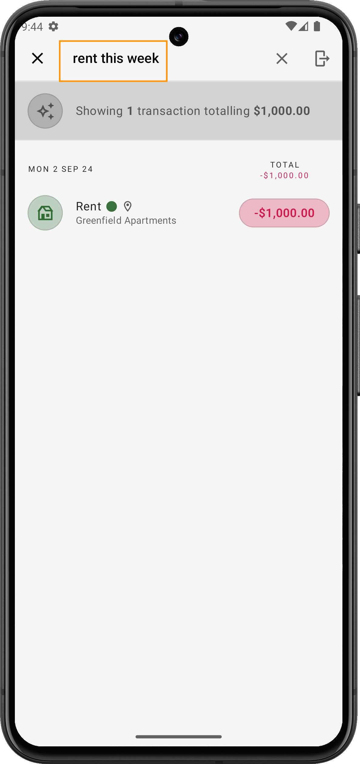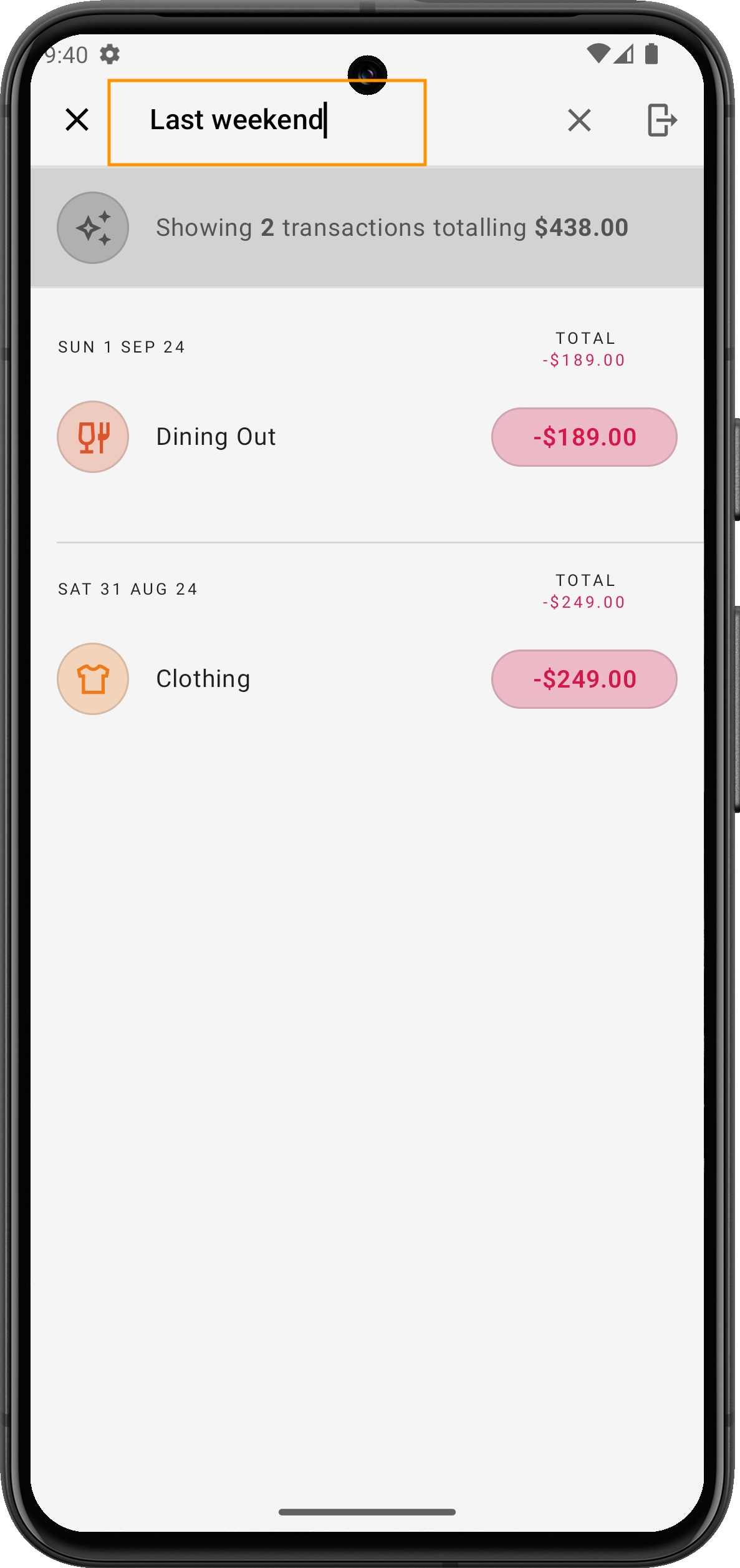 Este recurso permite que você busque transações usando linguagem natural, facilitando mais do que nunca encontrar exatamente o que procura. Você pode usar frases ou filtros como "último fim de semana", "> 100" ou "este mês > 1000" para obter resultados rápidos e intuitivos.