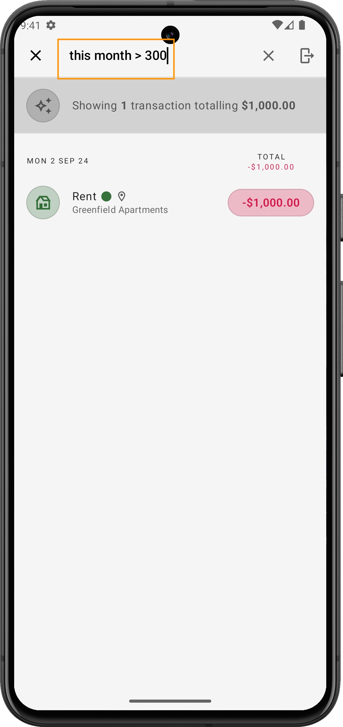 "Este mês > 1000": Quer revisar gastos altos do mês atual? Esta busca exibirá todas as transações acima de $1000 do mês em um piscar de olhos.