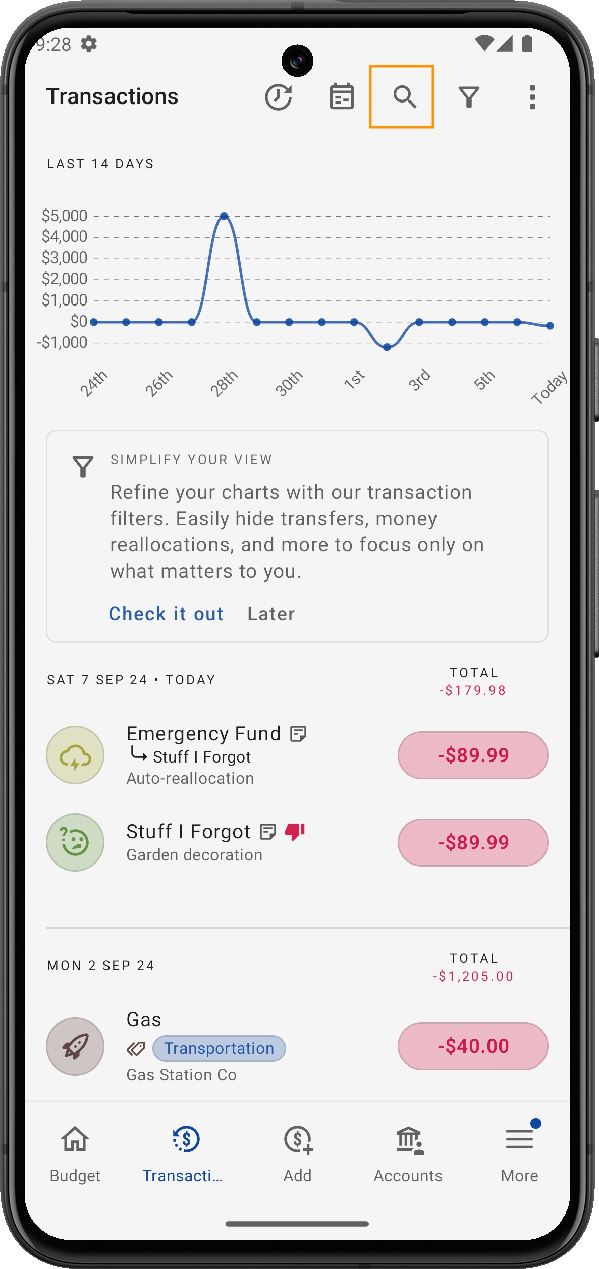 Em vez de rolar longas listas de transações, você pode localizar exatamente o que precisa em segundos com a Busca Inteligente. Seja para verificar os gastos do "último fim de semana" ou todas as compras acima de $200, você obtém resultados instantâneos com apenas alguns toques.