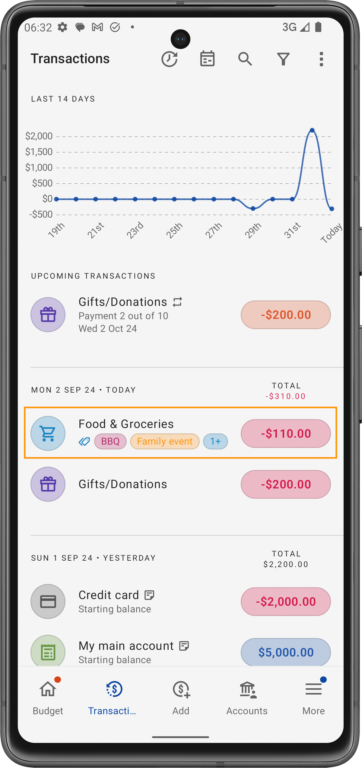 Caso de Uso: Isso é útil para revisar rapidamente suas atividades mais recentes. Por exemplo, depois de marcar uma compra como Churrasco, você pode vê-la imediatamente na lista de transações recentes para garantir que tudo está devidamente categorizado.